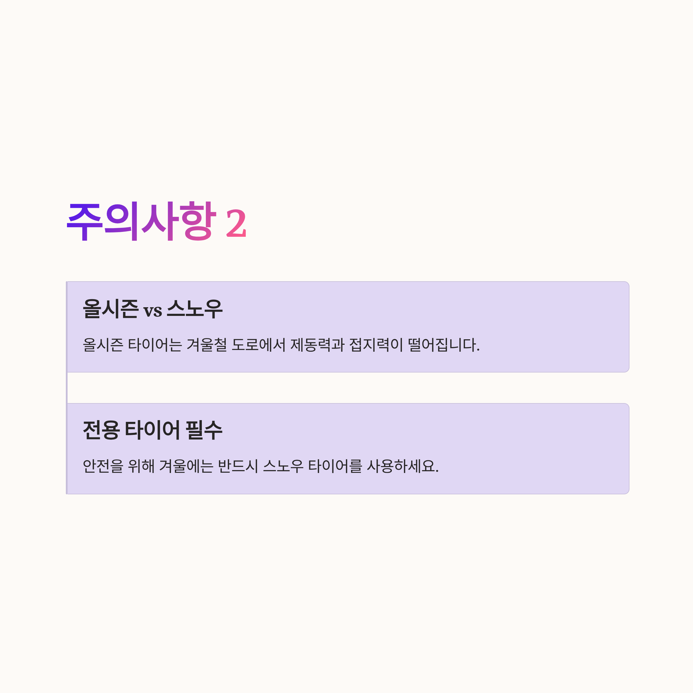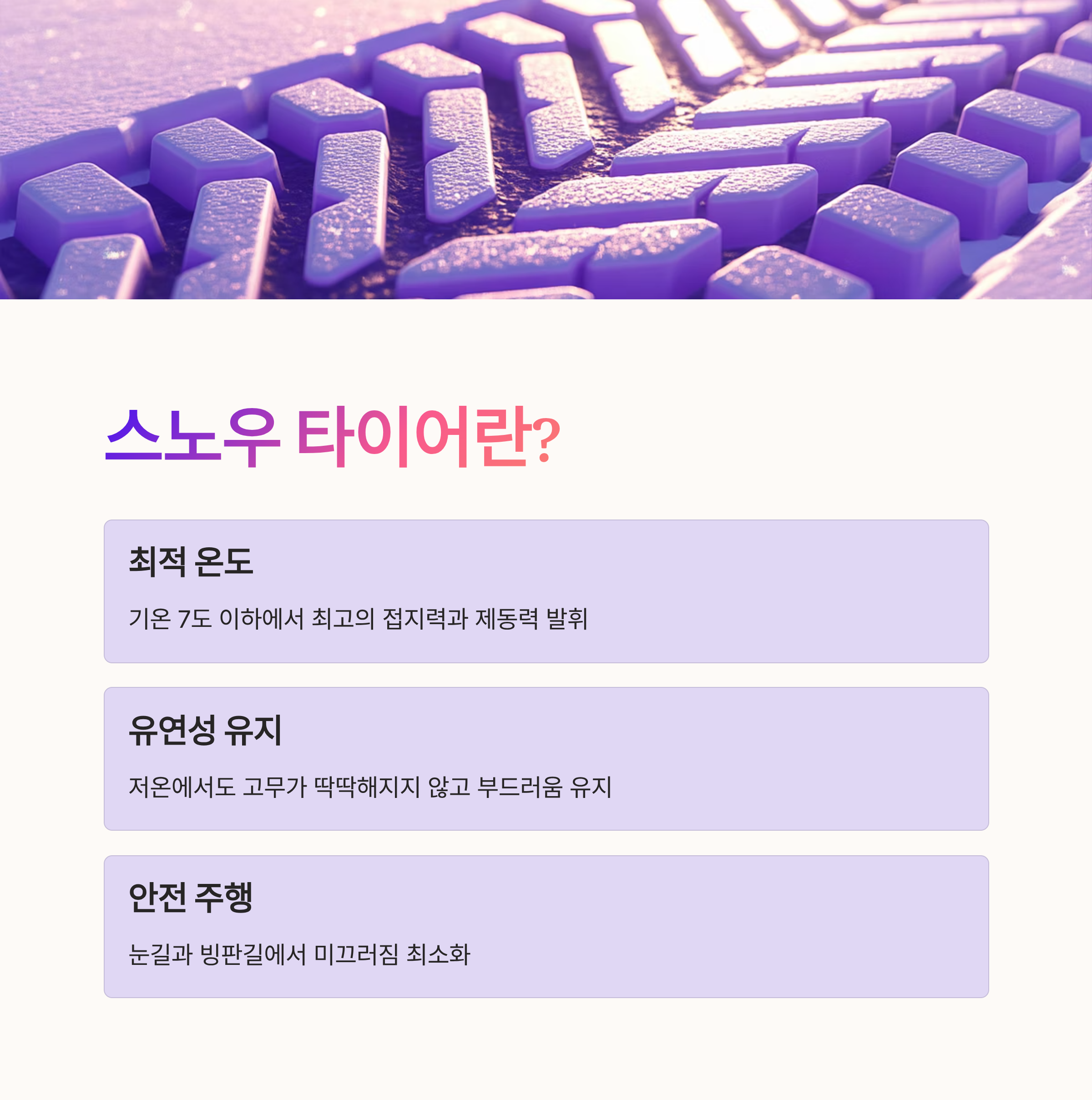 1 스노우 타이어는 여름철 사용을 피해야 한다. 고무가 부드러워 고온 환경에서는 마모가 빠르고 소음이 커질 수 있다.