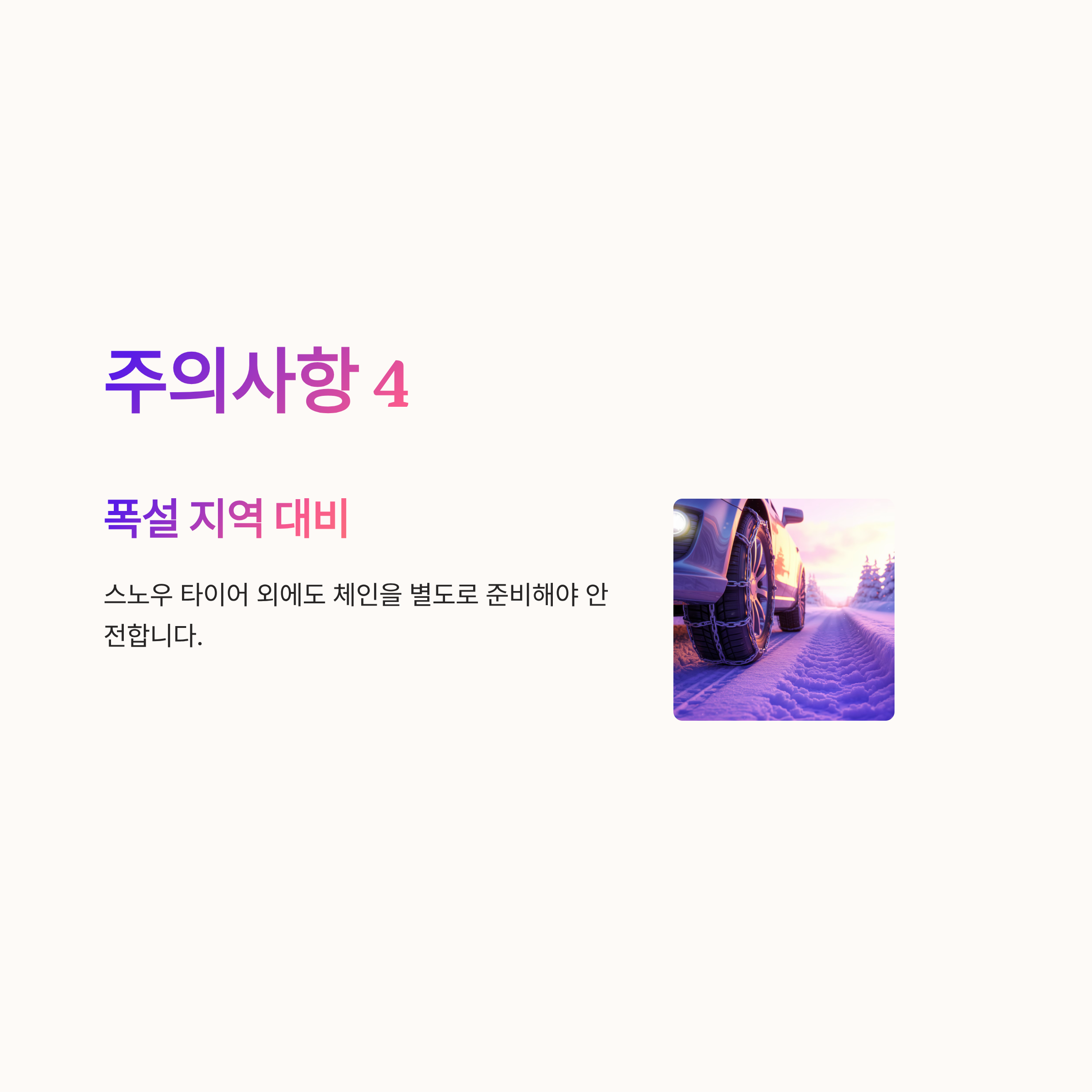 4 폭설 지역에서는 스노우 타이어 외에도 체인을 별도로 준비해야 안전하다.