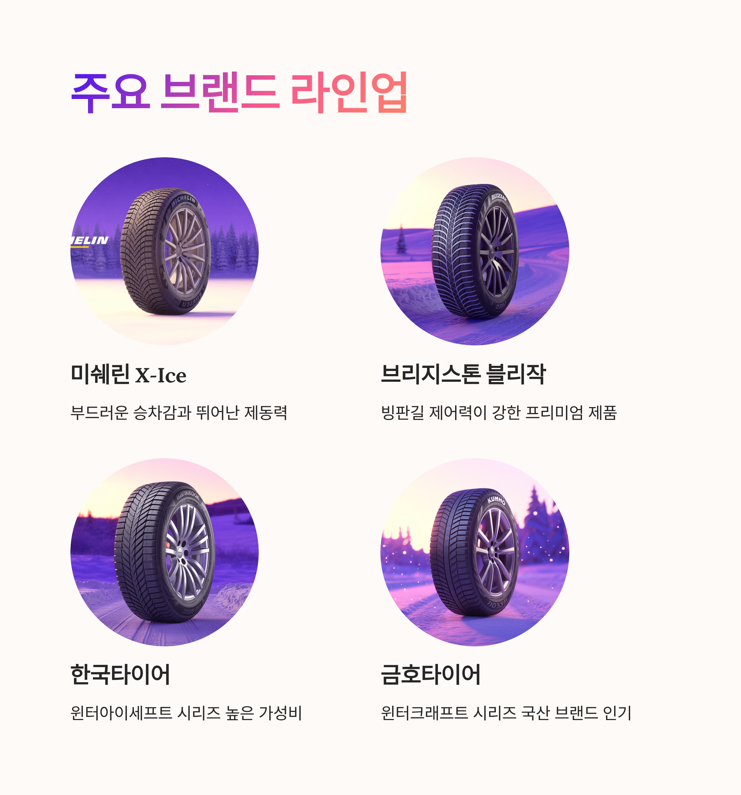 미쉐린 X-Ice 시리즈는 부드러운 승차감과 제동력으로 유명하며 브리지스톤 블리작 시리즈는 빙판길 제어력이 강한 제품이다. 한국타이어의 윈터아이세프트 금호타이어의 윈터크래프트 시리즈는 국산 브랜드 중에서도 가성비가 높아 많은 운전자들이 찾는다.