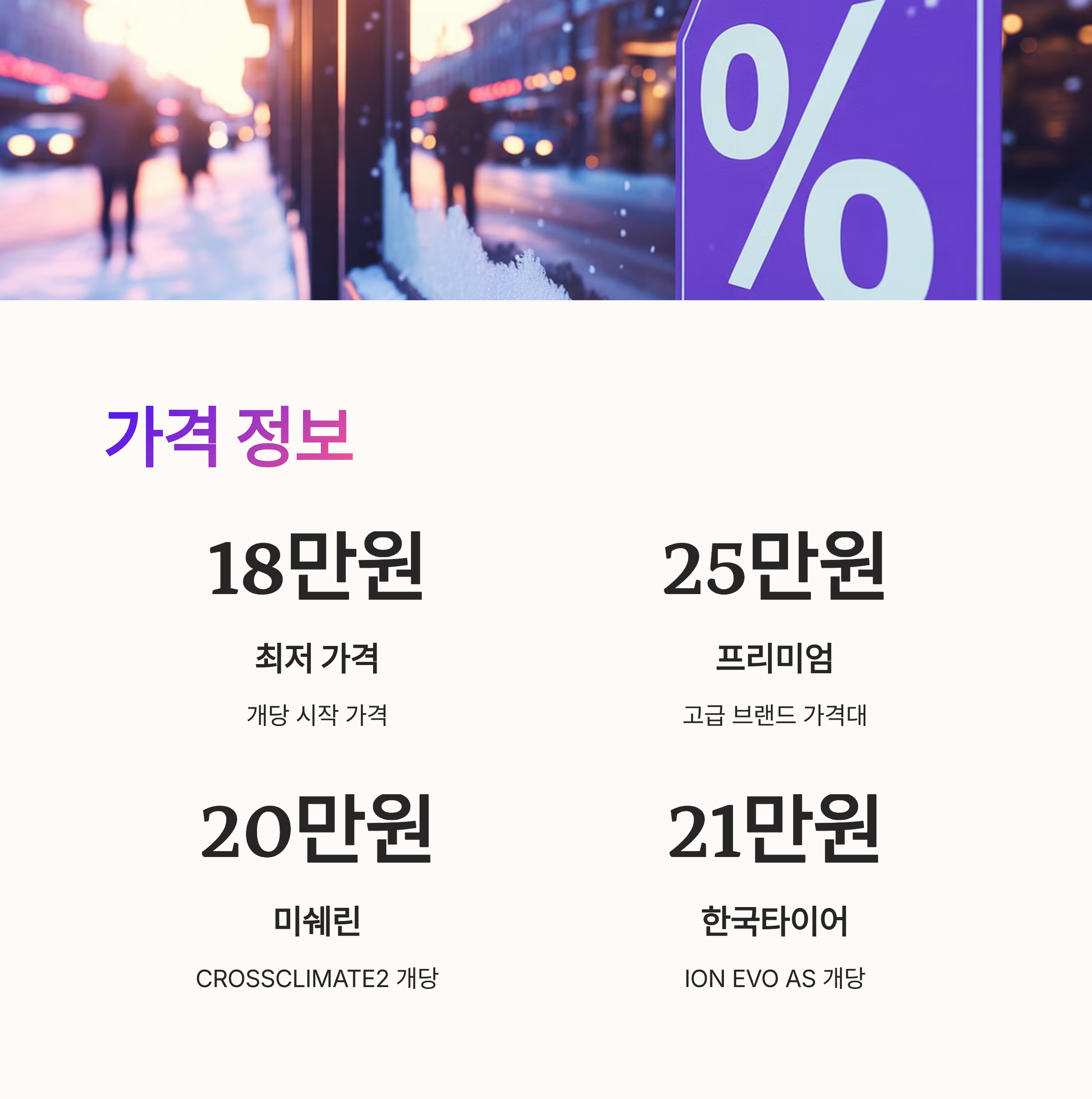 예를 들어 미쉐린 CROSSCLIMATE2는 개당 약 20만 원 한국타이어 ION EVO AS는 약 21만 원 수준이다. 행사 기간에는 4개 세트 구매 시 상품권 증정 추가 할인 3+1 이벤트 등 다양한 프로모션이 진행된다.