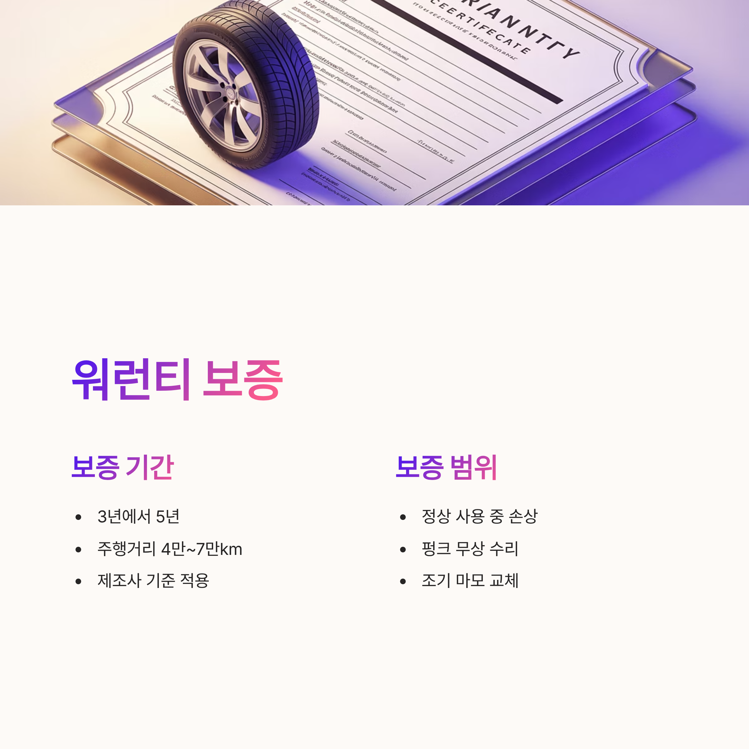 워런티 기간 내 정상적인 사용 중 타이어 손상이나 펑크가 발생한 경우 무상 수리 혹은 교체를 받을 수 있다. 단 고의적인 손상이나 과도한 마모 비정상적인 주행 환경에서는 워런티가 적용되지 않을 수 있으므로 구입 시 조건을 반드시 확인해야 한다.