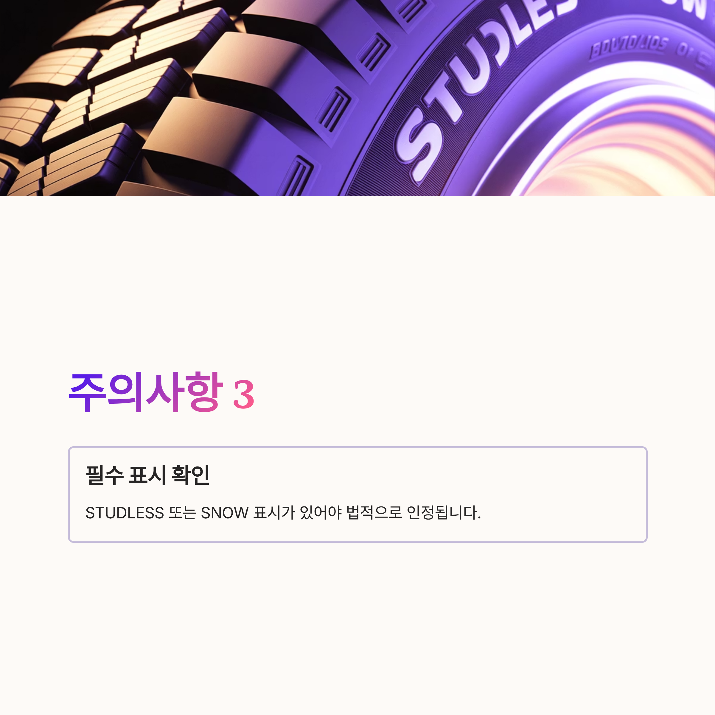 3 스노우 타이어에는 STUDLESS 또는 SNOW 표시가 있어야 한다. 해당 표기가 없는 제품은 법적으로 겨울용 타이어로 인정되지 않는다.