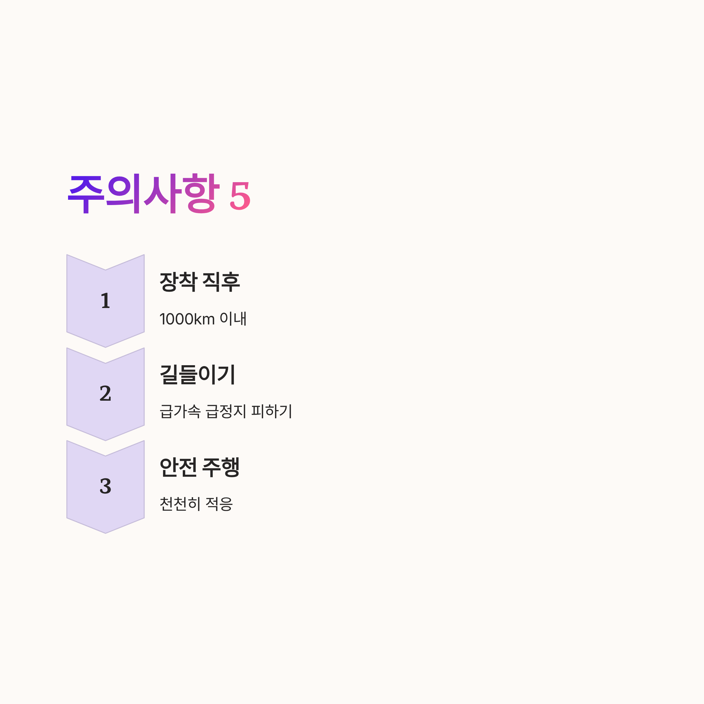 5 장착 후 1000킬로미터 이내에는 급가속 급정지를 피하고 천천히 주행하며 길들이기를 하는 것이 좋다.