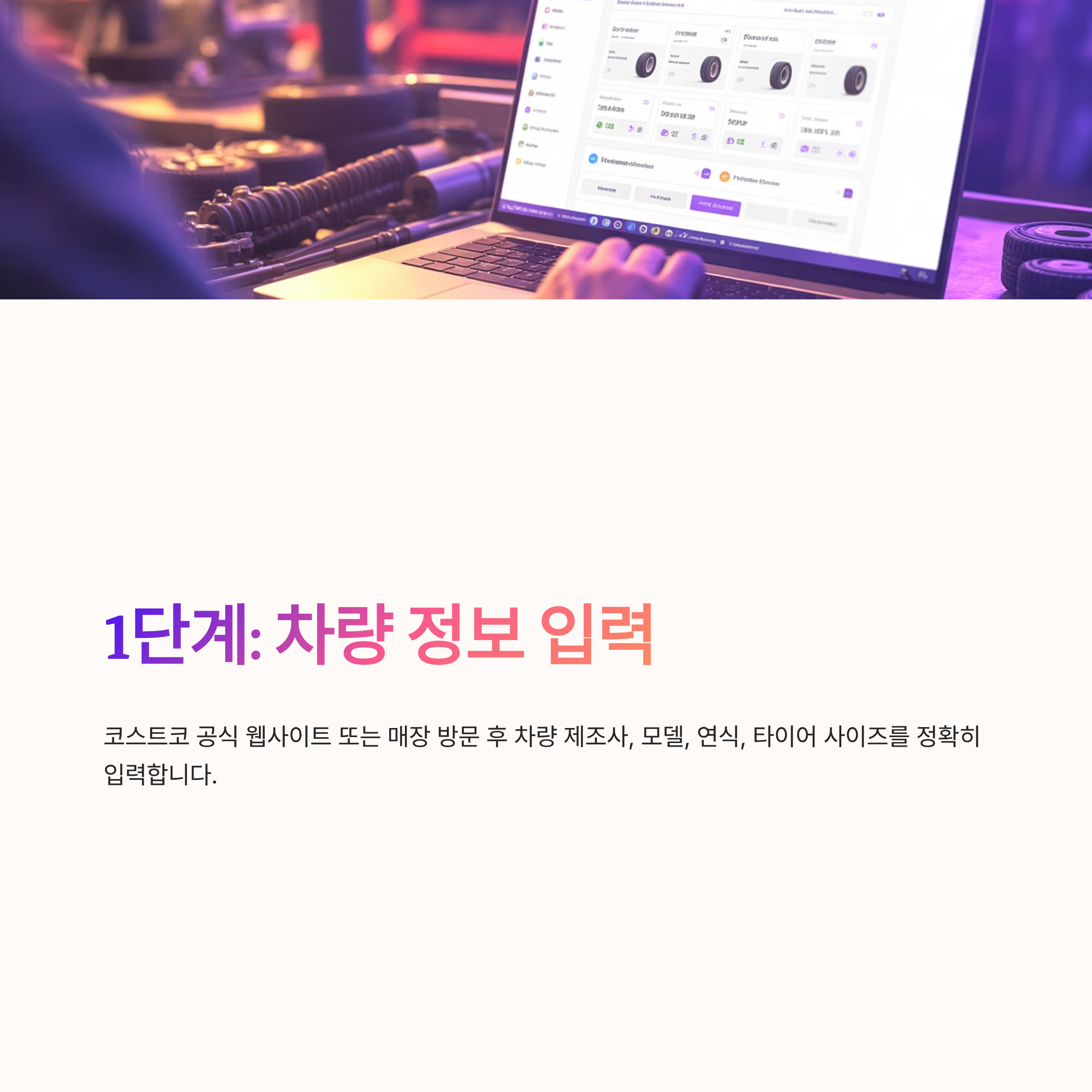 1 코스트코 공식 웹사이트 또는 매장 방문 후 차량 제조사 모델 연식 타이어 사이즈를 입력한다.