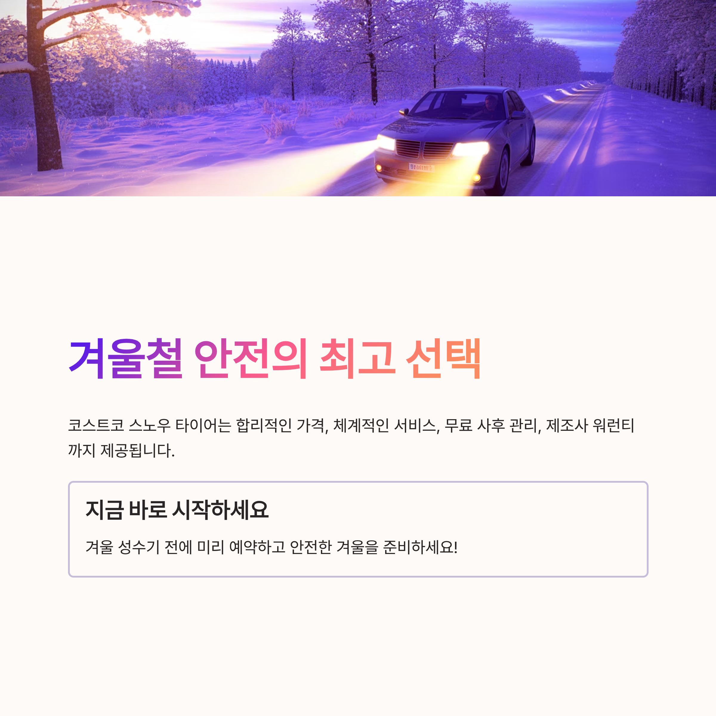 구매 전 차량 모델에 맞는 규격과 워런티 조건을 반드시 확인하고 겨울철 성수기 전에 미리 예약하는 것이 현명하다. 눈길과 빙판길에서도 안전하고 안정적인 주행을 원한다면 코스트코 스노우 타이어는 최고의 선택이 될 것이다.