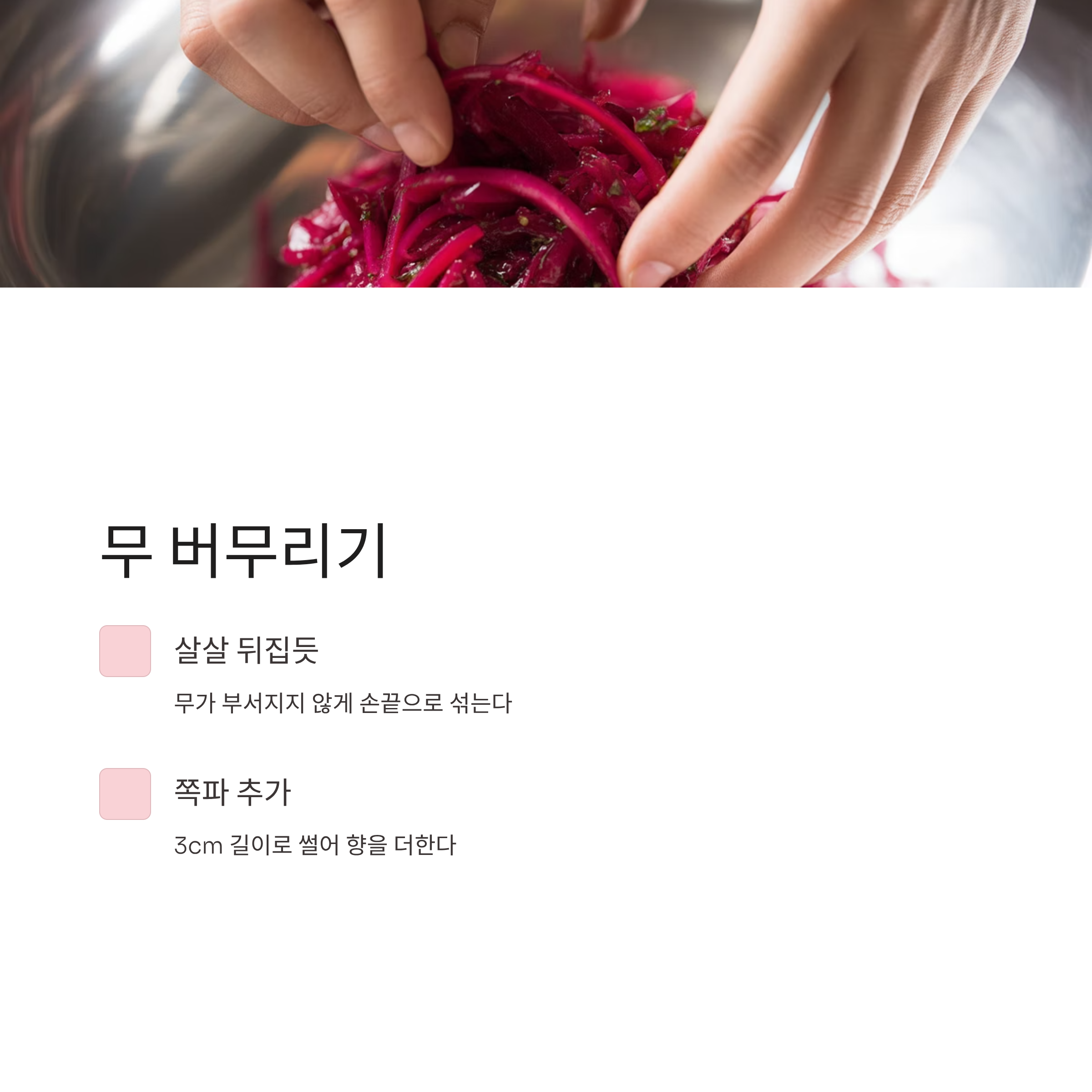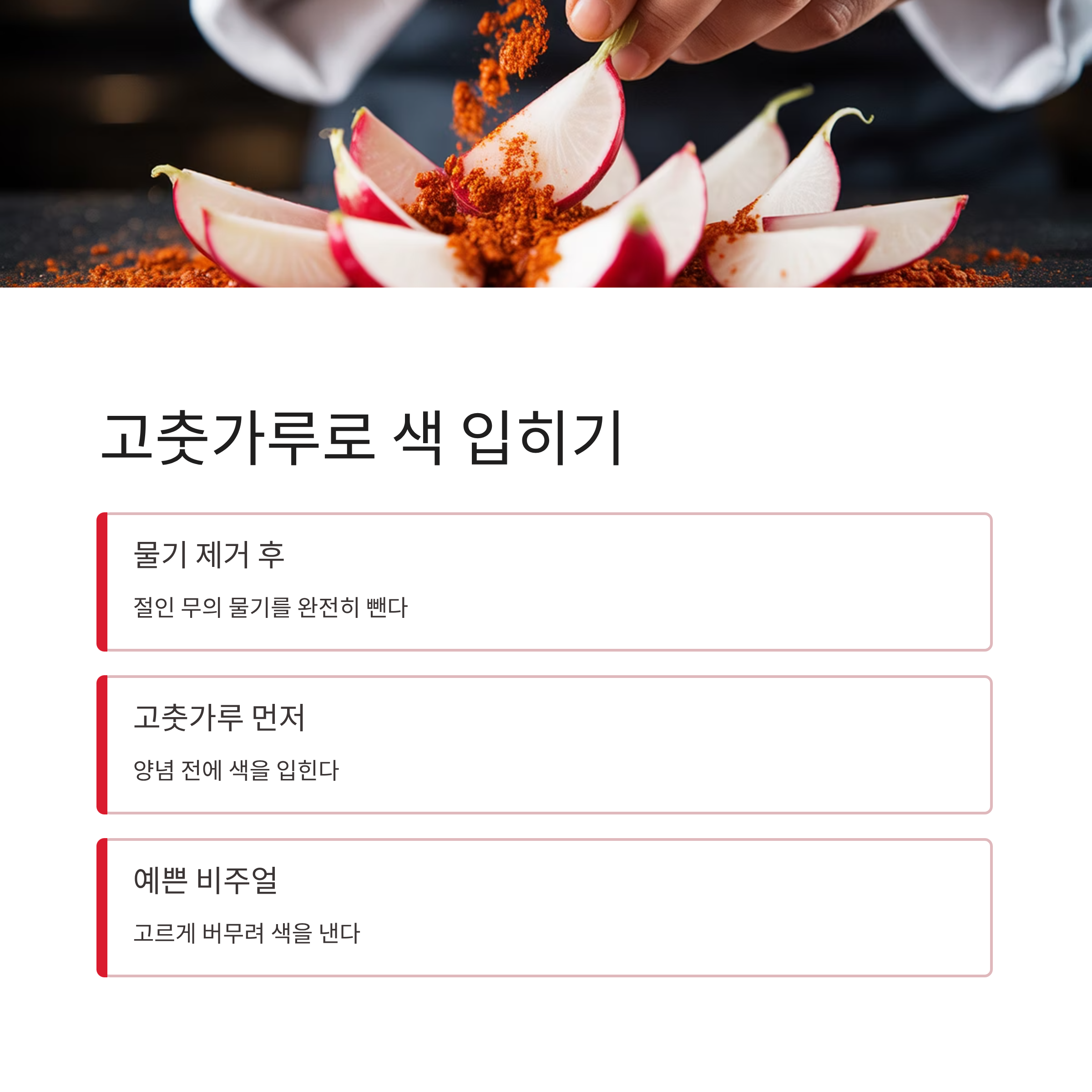 고춧가루로 색을 낸 무에 양념장을 붓고 살살 뒤집듯 버무린다. 무가 부서지지 않도록 손끝으로 살살 섞는 것이 포인트다. 이때 쪽파를 3센티미터 길이로 썰어 함께 넣으면 향이 더해진다.