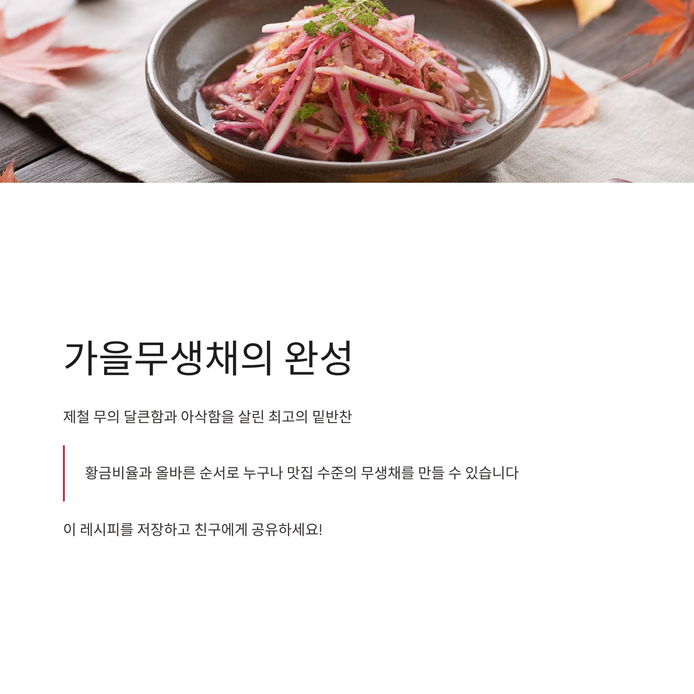 가을은 무가 가장 맛있는 계절이다. 달고 아삭한 제철 무를 활용한 가을무생채는 김치보다 간단하지만 맛은 결코 뒤지지 않는 대표 밑반찬이다.