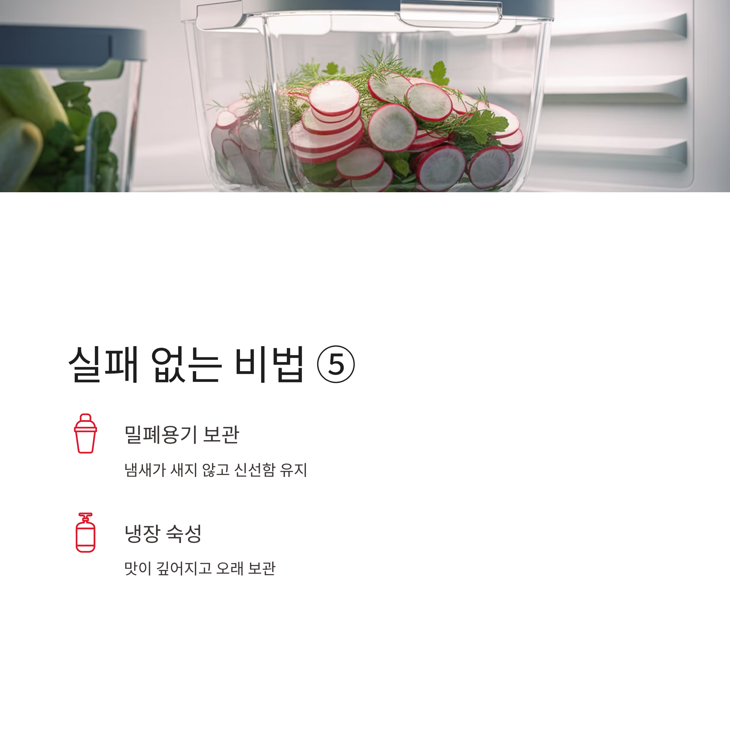 다섯째 냉장 숙성 시 밀폐용기에 보관해야 냄새가 새지 않고 신선함이 유지된다.