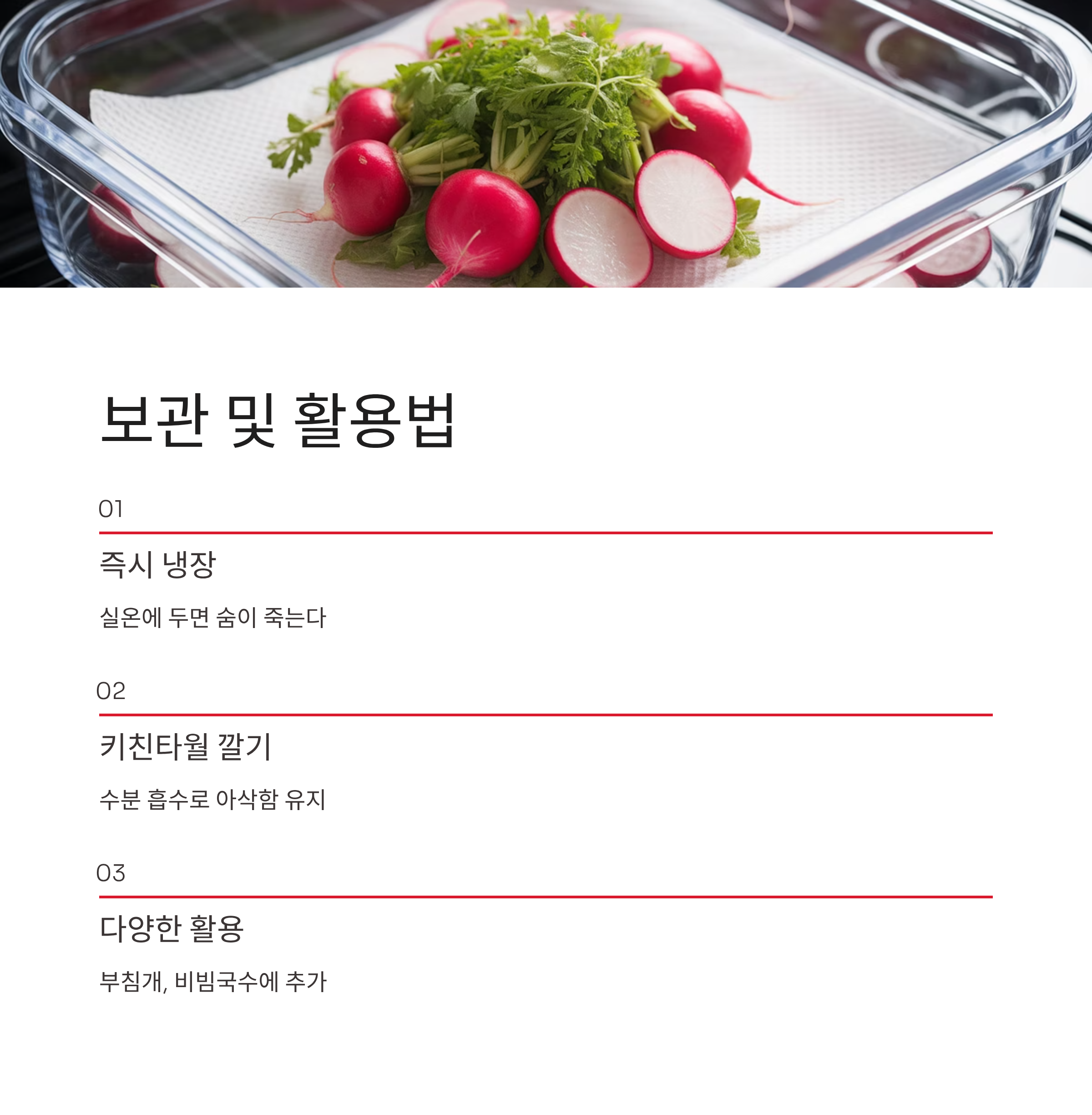 무생채는 실온에 두면 금세 숨이 죽기 때문에 버무린 직후 냉장 보관해야 한다. 반찬통 밑에 키친타월을 한 장 깔아두면 남은 수분이 흡수되어 아삭함이 오래 유지된다. 남은 무생채는 부침개나 비빔국수에 넣어 활용해도 좋다.