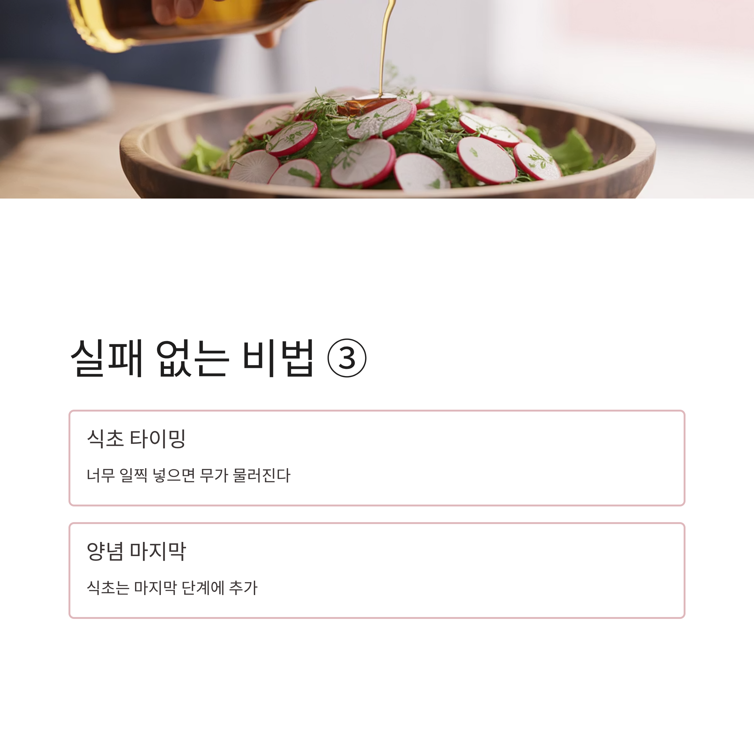 셋째 식초를 너무 일찍 넣으면 무가 물러질 수 있으니 양념 마지막에 넣는 것이 좋다.