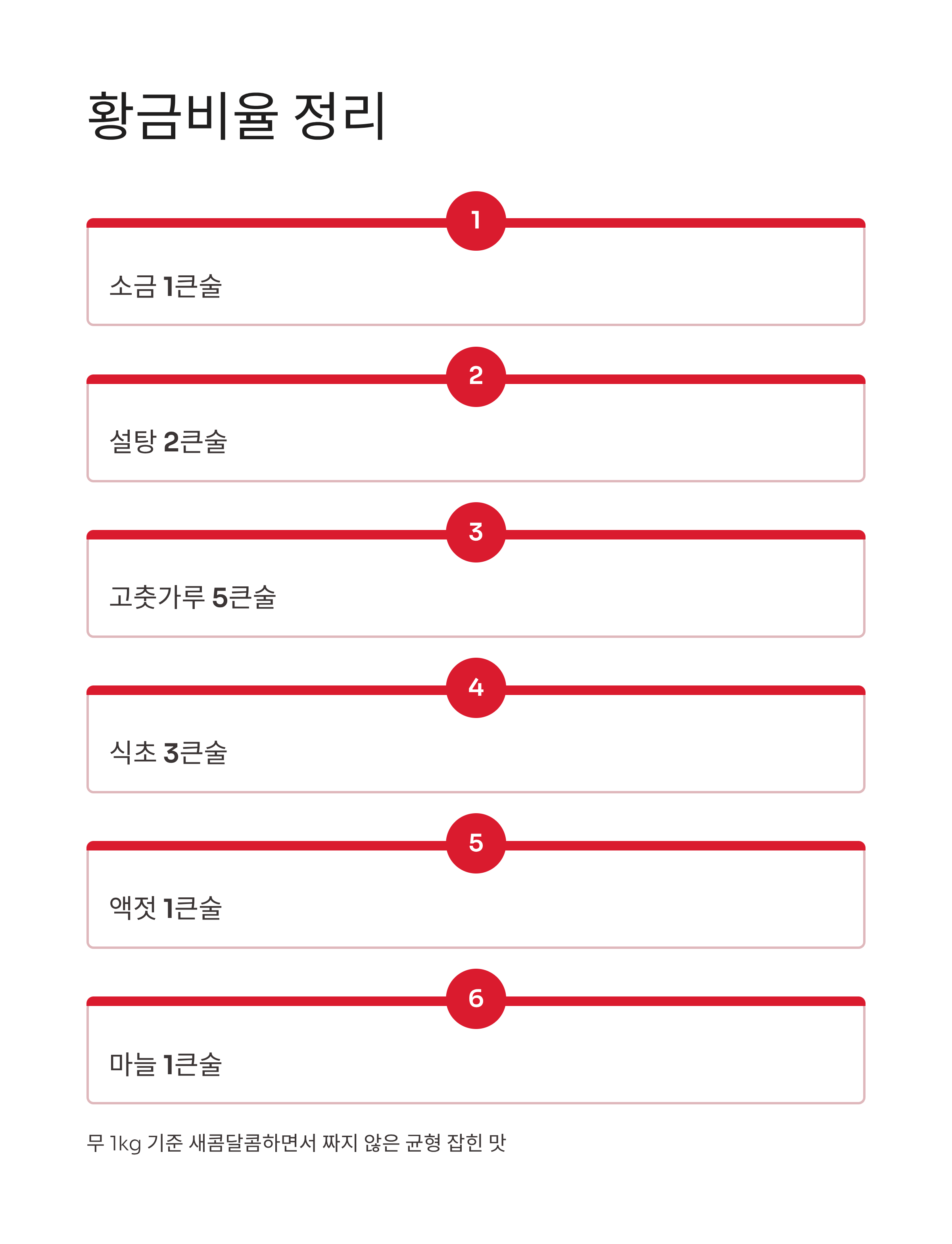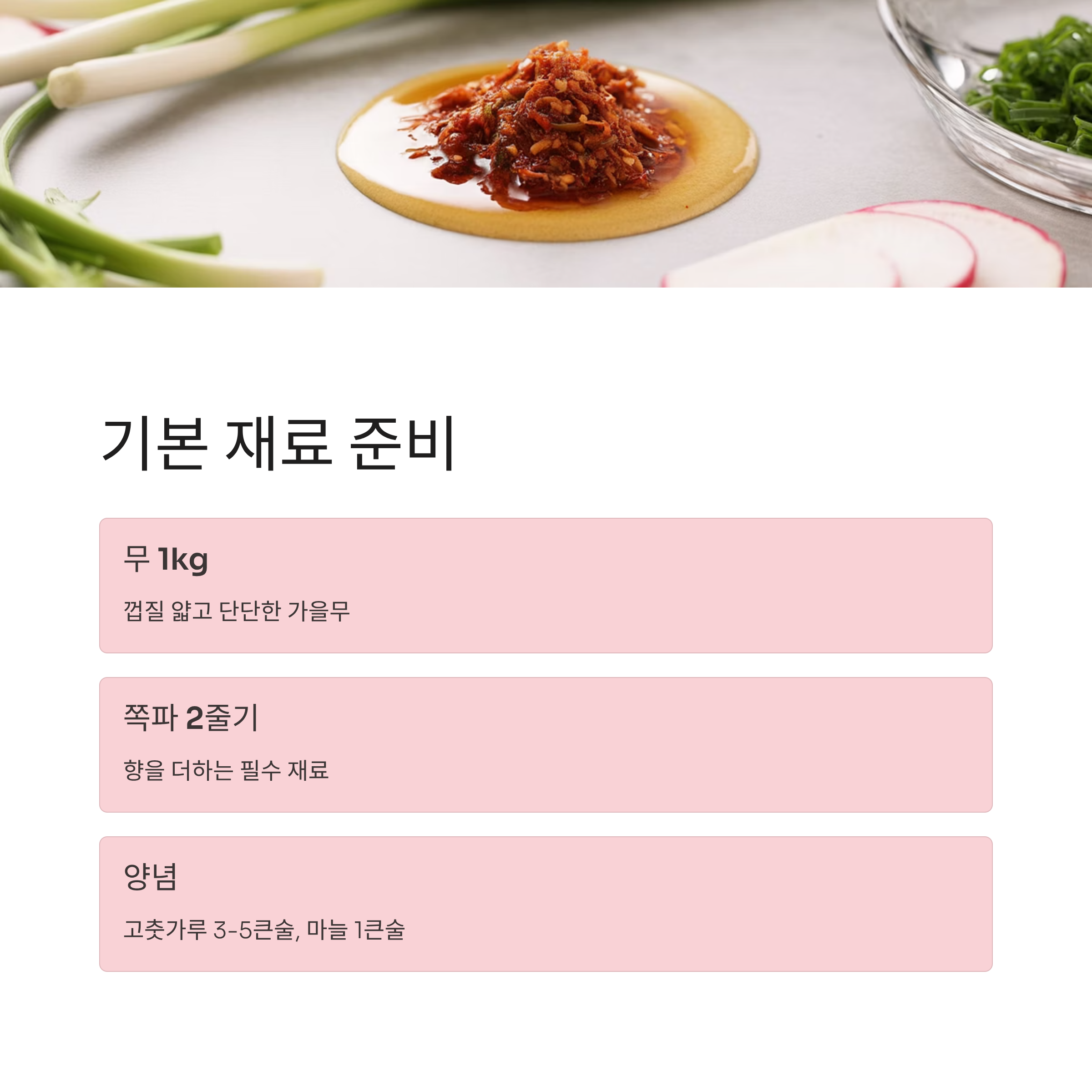 무 1kg 기준으로 소금 1큰술, 설탕 2큰술, 고춧가루 5큰술, 식초 3큰술, 액젓 1큰술, 간장 1큰술, 다진 마늘 1큰술, 통깨와 쪽파 약간을 사용하면 가장 균형 잡힌 맛을 낸다. 새콤달콤하면서도 짜지 않은 기본 황금비율로 식당 수준의 맛을 구현할 수 있다.