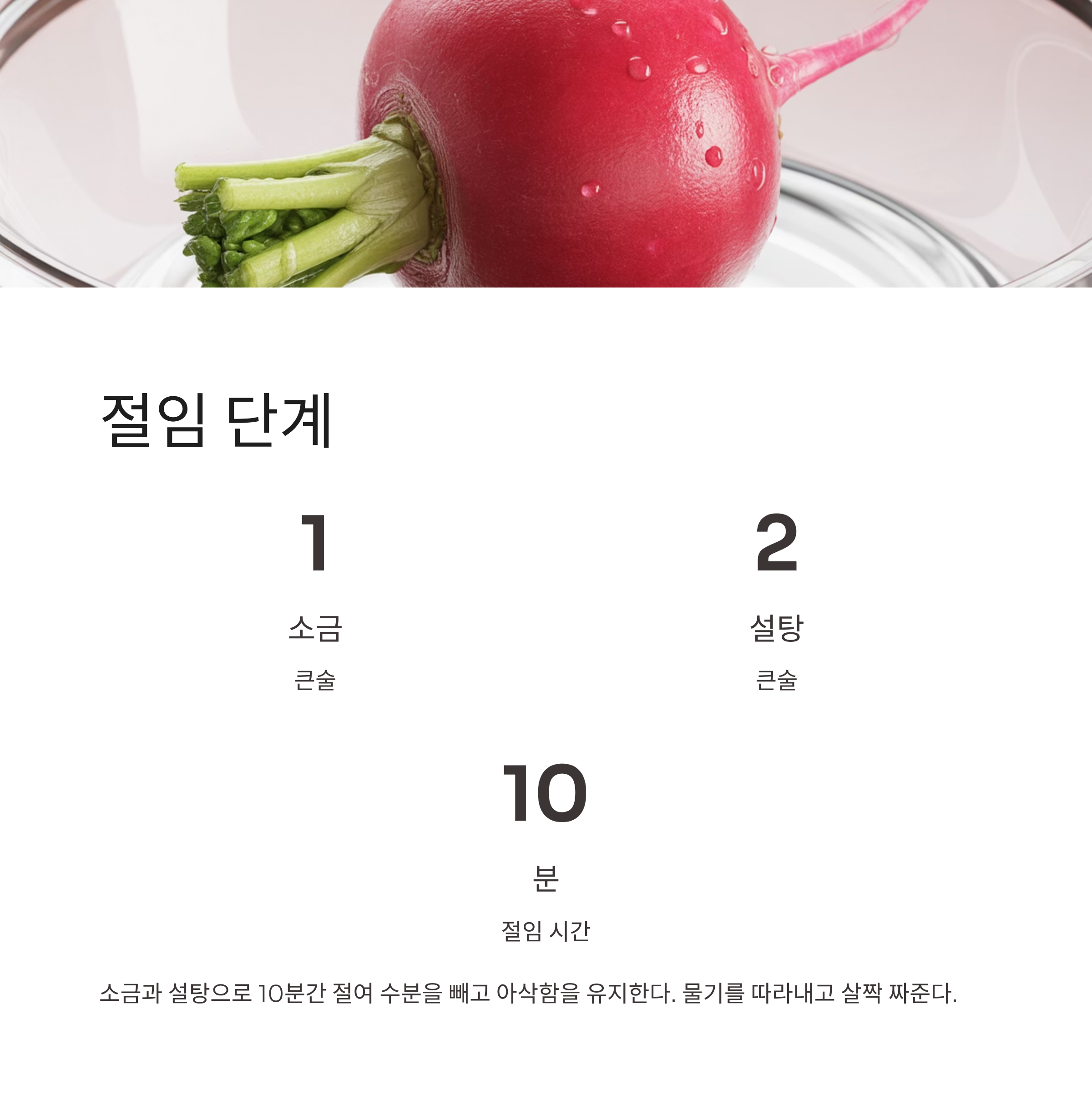 첫째 절이는 시간을 10분 이상 넘기지 않는다. 오래 절이면 무의 아삭함이 줄어든다.
