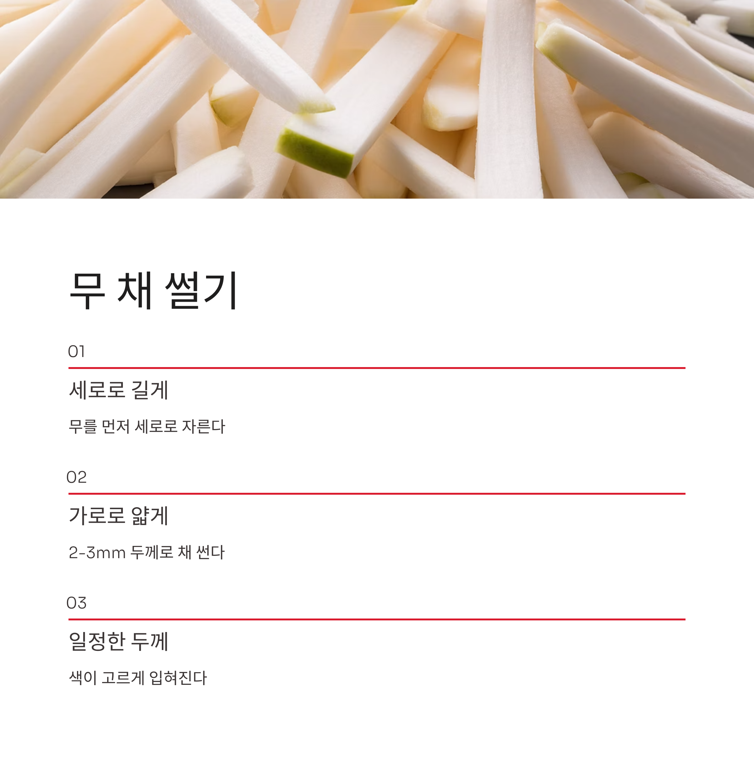 무는 길게 세로로 썬 후 가로로 얇게 채 썬다. 두께는 2~3밀리미터가 적당하다. 너무 두껍게 썰면 양념이 배지 않고 너무 얇으면 숨이 죽어버려 아삭함이 사라진다. 일정한 두께로 썰어야 버무릴 때 색이 고르게 입혀진다.