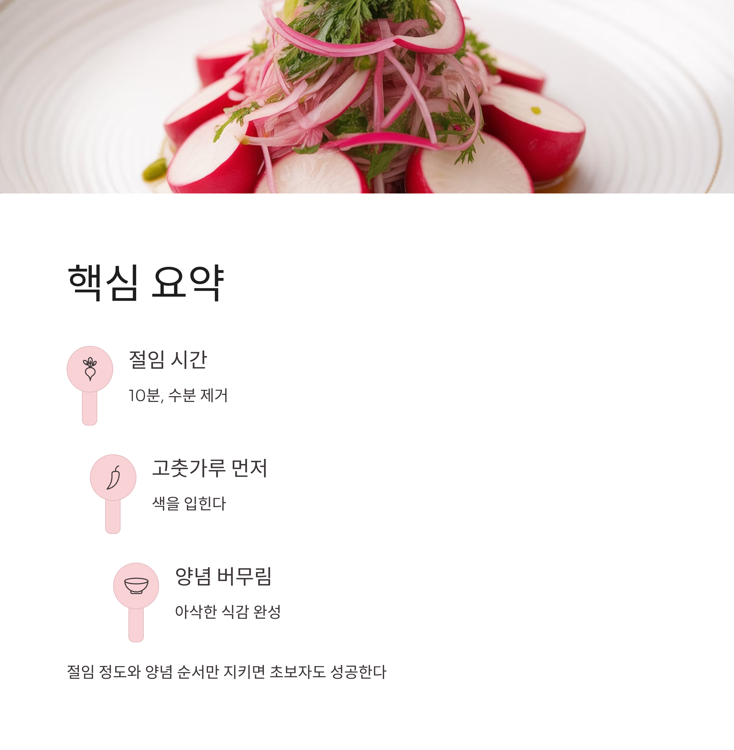 가을무생채의 핵심은 절임 시간과 양념 순서다. 무를 절여 수분을 뺀 뒤 고춧가루로 먼저 색을 입히고 그다음 양념을 버무려야 아삭하고 물기 없는 식감이 완성된다. 무의 신선도와 절임 정도만 조절하면 초보자도 쉽게 맛있는 무생채를 만들 수 있다.