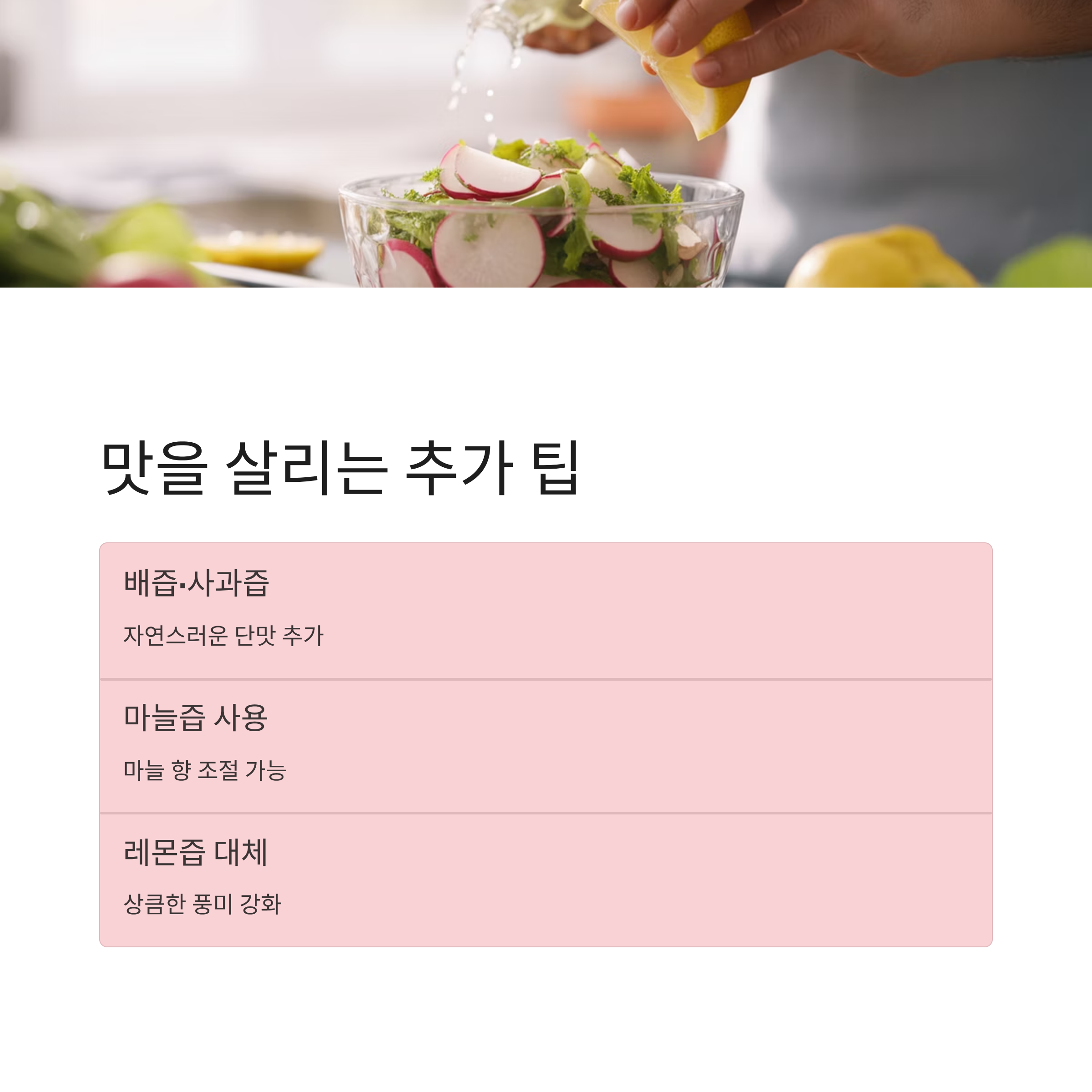 무의 단맛이 부족할 경우 설탕 대신 배즙이나 사과즙을 한 큰술 넣으면 자연스러운 단맛을 더할 수 있다. 마늘 향을 줄이고 싶다면 다진 마늘 대신 마늘즙을 넣는 것도 방법이다. 식초 대신 레몬즙을 사용하면 상큼한 풍미가 강해진다.