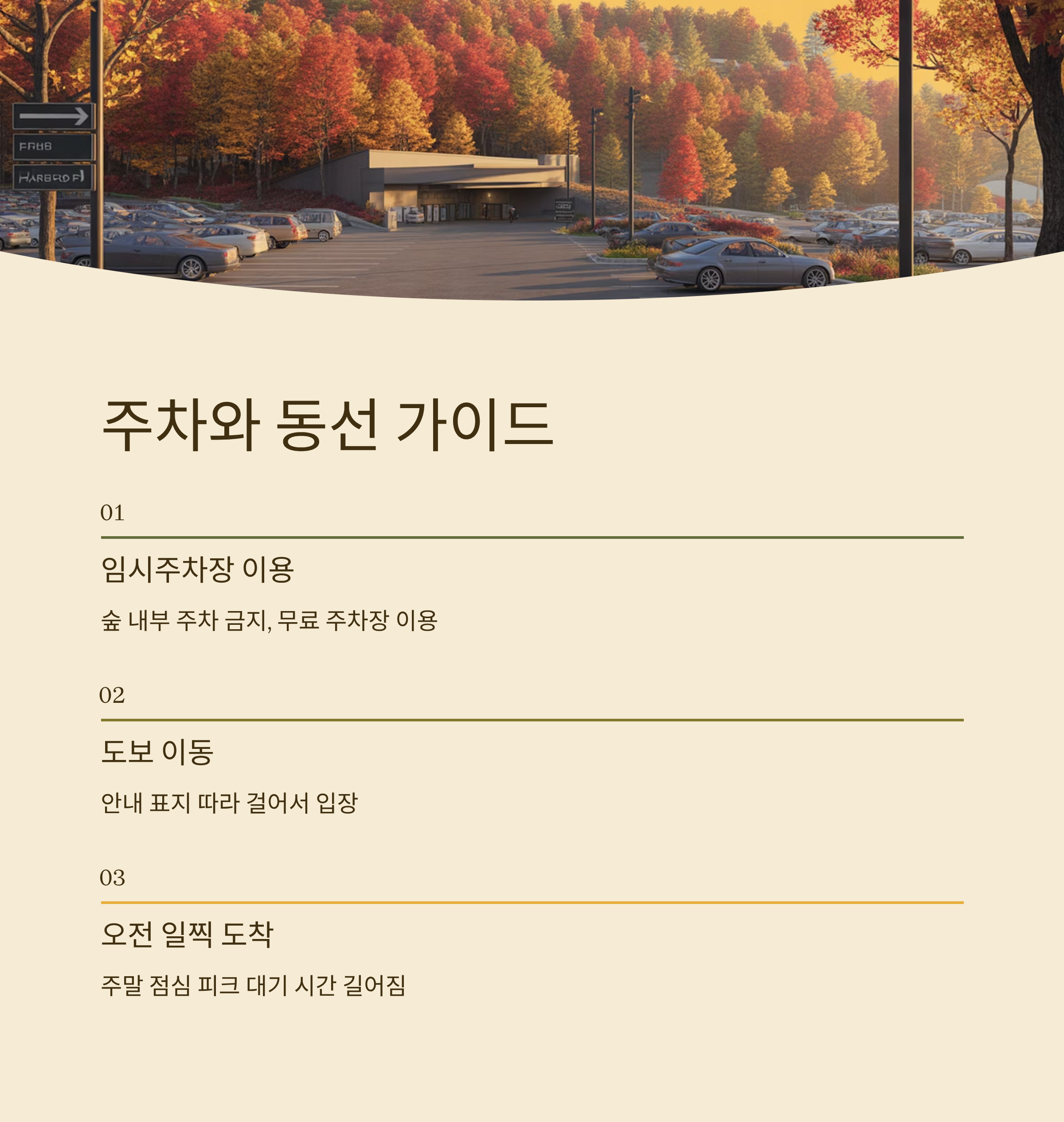 주차는 숲 내부 불가. 주변 임시주차장 무료 이용 후 도보 이동