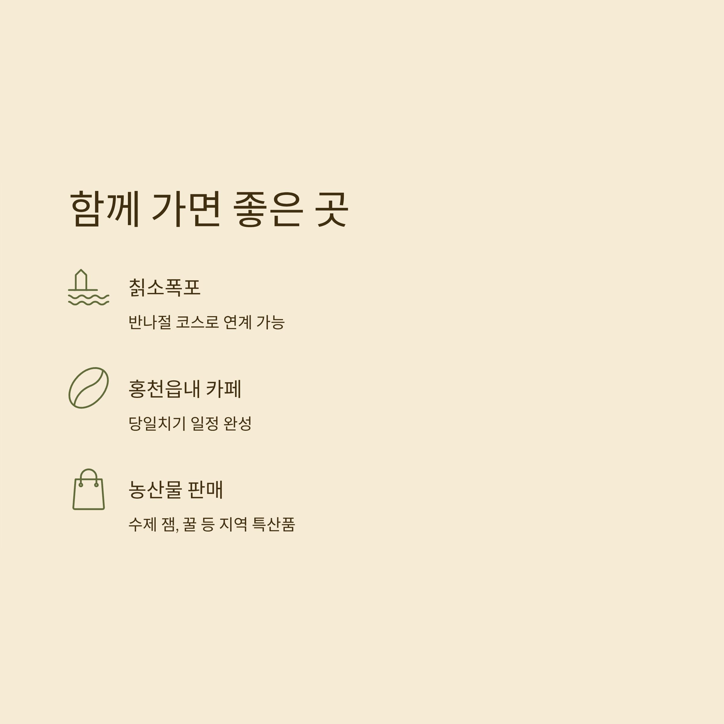 홍천읍내 카페와 현지 음식점까지 더하면 당일치기 일정이 안정적으로 구성된다.