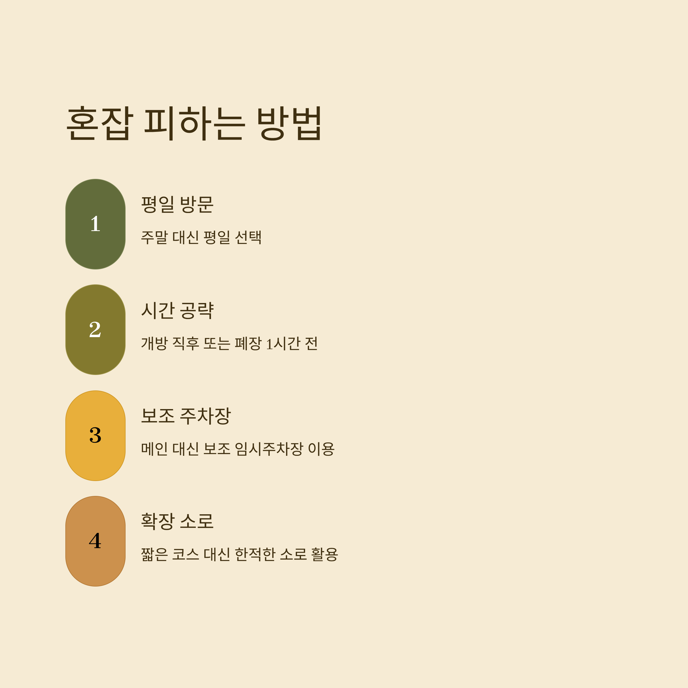 성수기에는 임시 셔틀이나 교통 유도 인원이 배치되는 경우가 있으니 현장 안내를 따르면 된다. 주말 점심 피크에는 주차 대기 시간이 길어질 수 있어 오전 일찍 도착하는 것이 가장 효율적이다.
