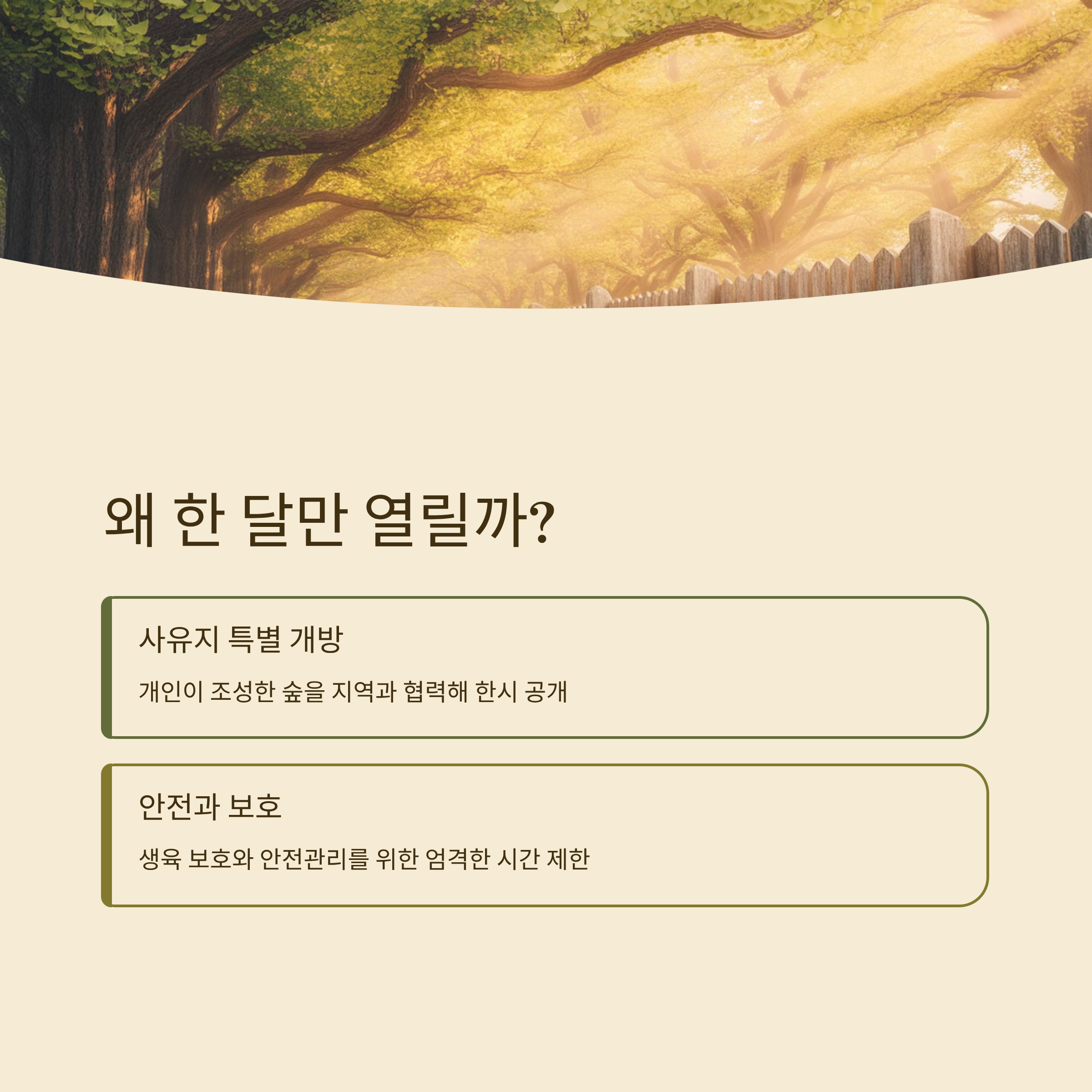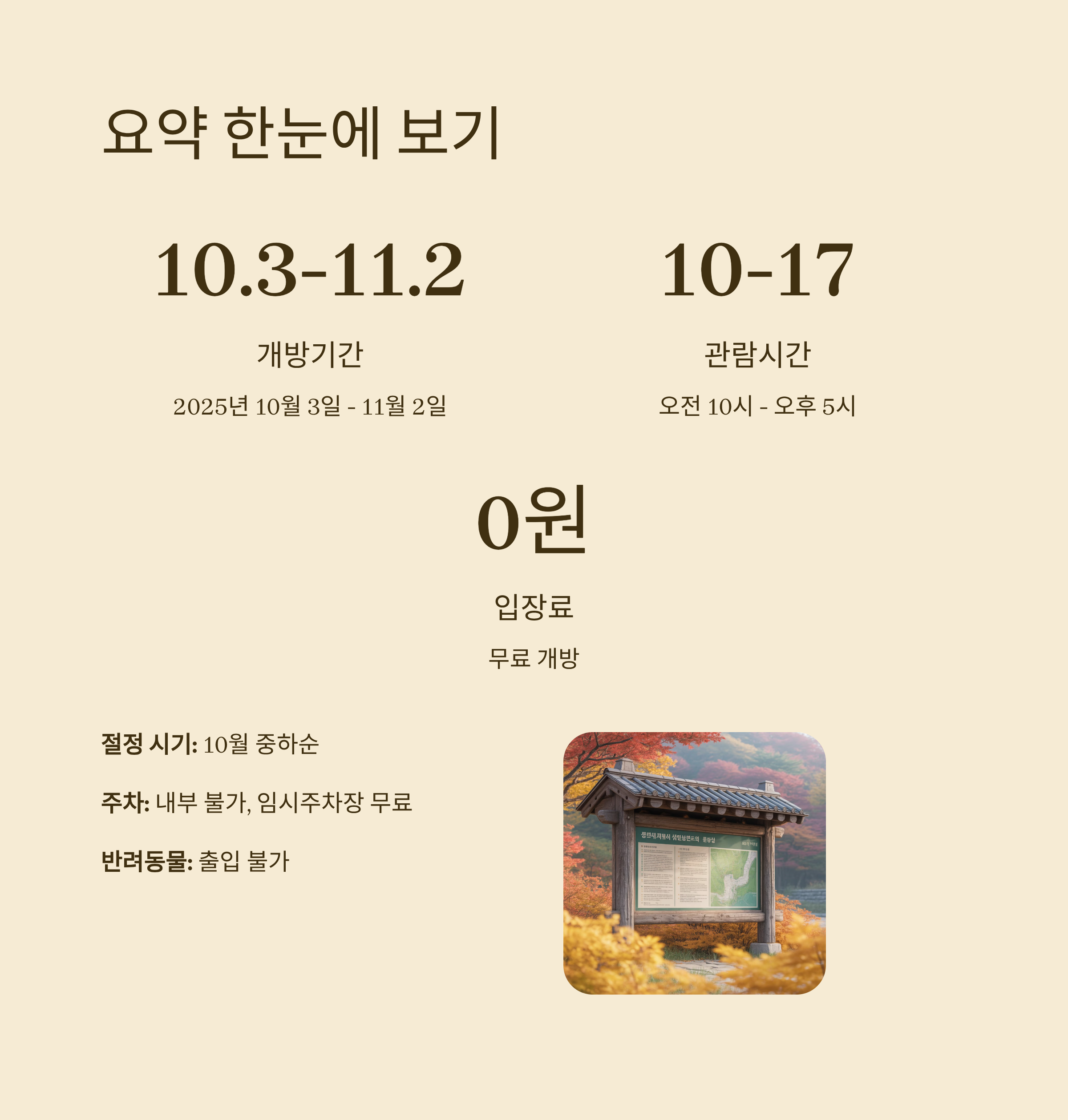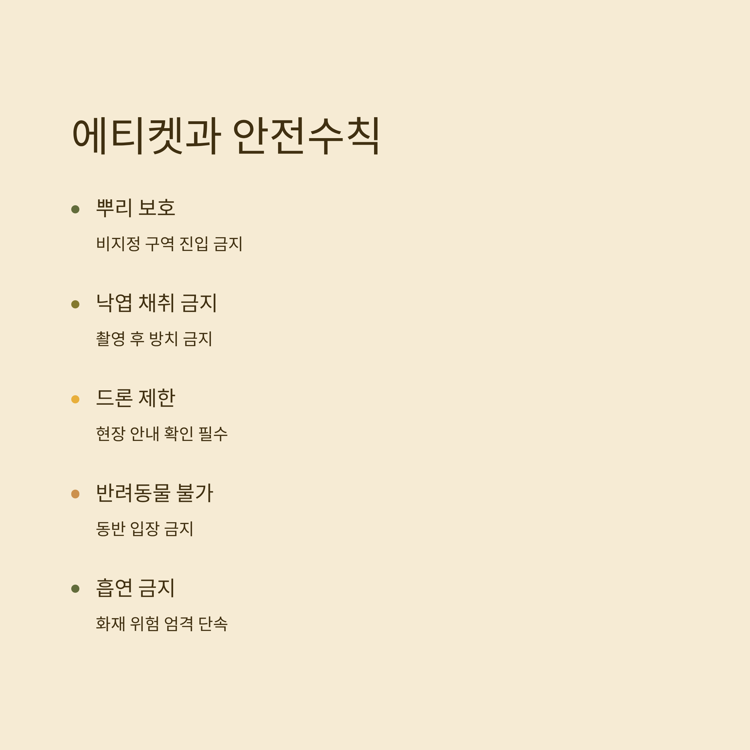 주차와 동선 규정이 엄격하고 반려동물 출입이 불가하므로 방문 전 안내를 숙지하고, 안전수칙과 에티켓을 지키며 관람하면 가장 아름다운 순간을 편안하게 즐길 수 있다.
