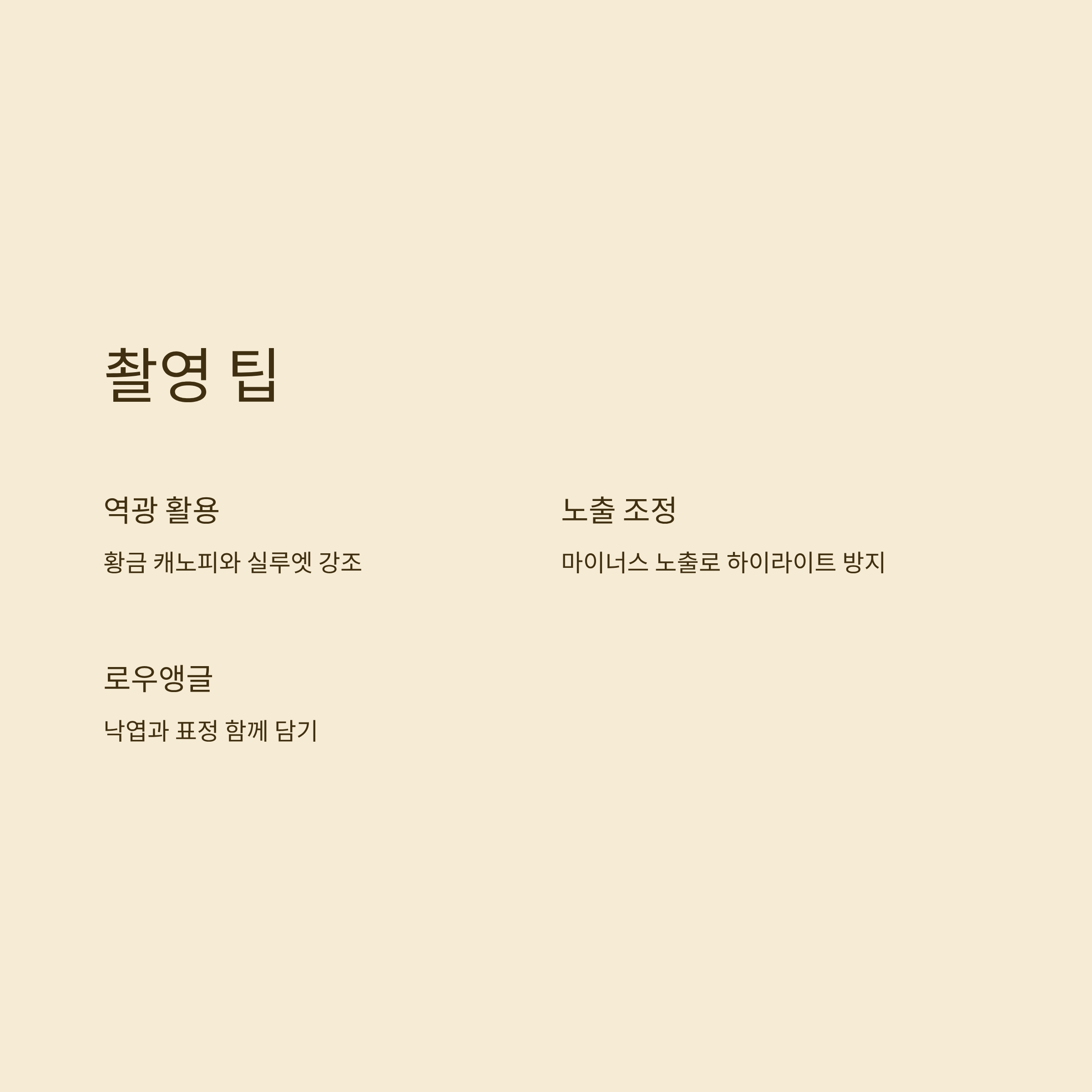 역광을 활용해 황금 캐노피와 실루엣을 강조하면 현장감이 살아난다