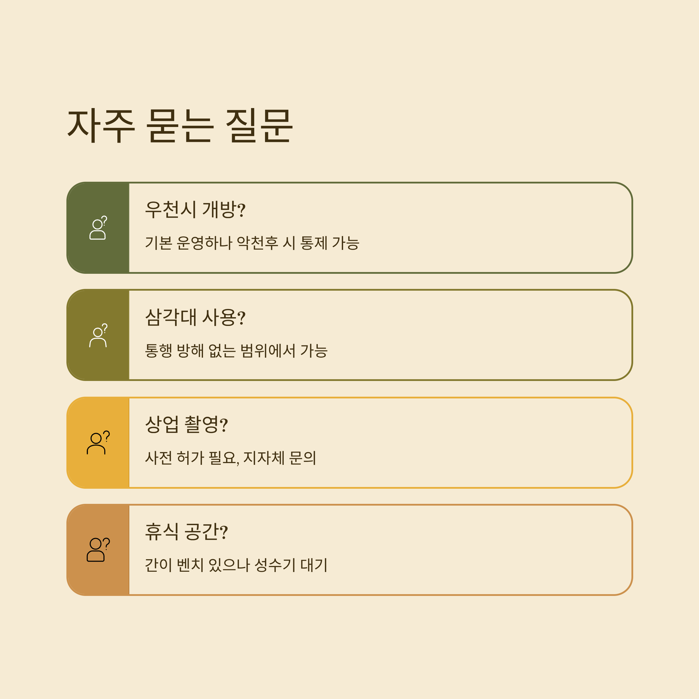기본적으로 우천시에도 운영하지만 강풍 호우 주의보 등 기상 악화 시 현장 판단으로 통제될 수 있다. 안전 안내를 따른다