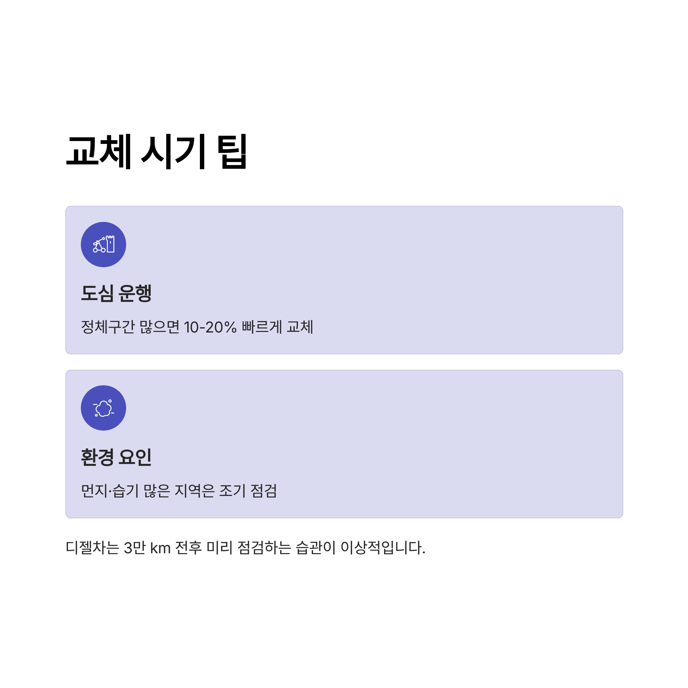 🚦 팁: 도심 정체구간이 많거나, 먼지·습기가 많은 환경에서 운행한다면 권장 주기보다 10~20% 빠르게 교체하는 것이 좋습니다.