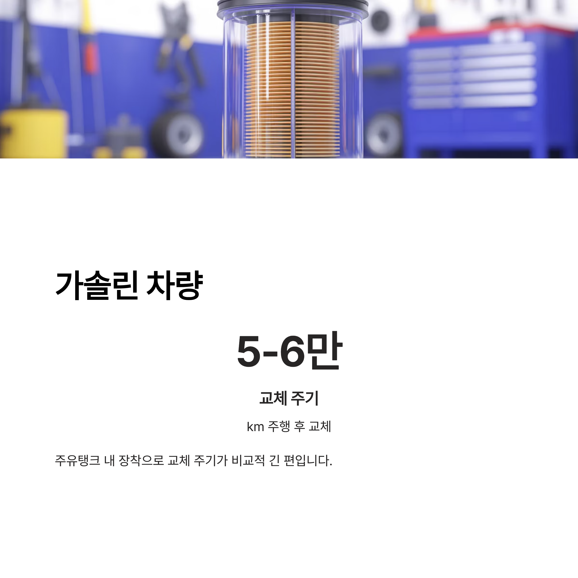 → 주유탱크 안에 장착되어 불순물만 거르며, 교체 주기가 비교적 길어요.