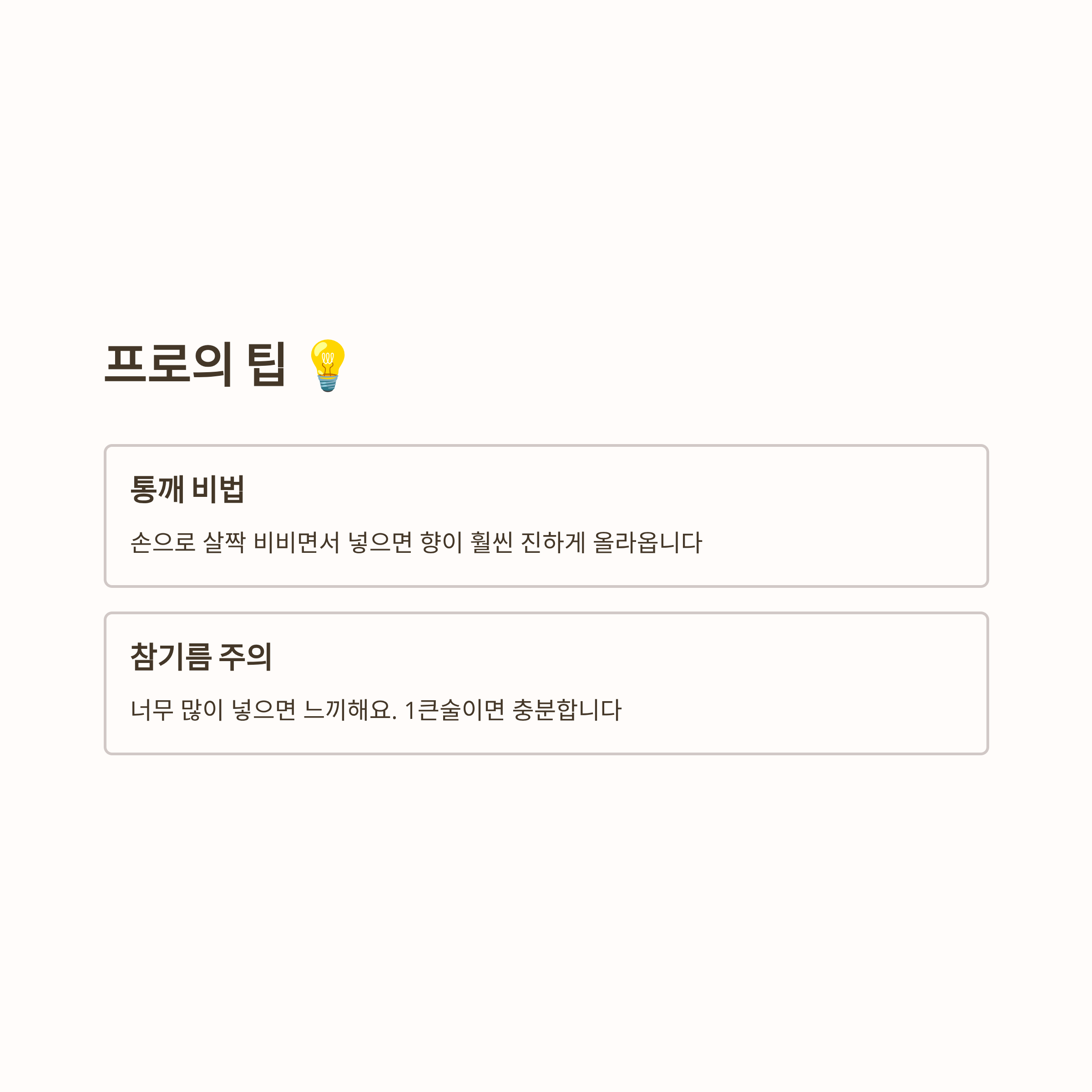 참기름은 너무 많이 넣으면 느끼해질 수 있으니 1큰술 정도면 충분합니다.