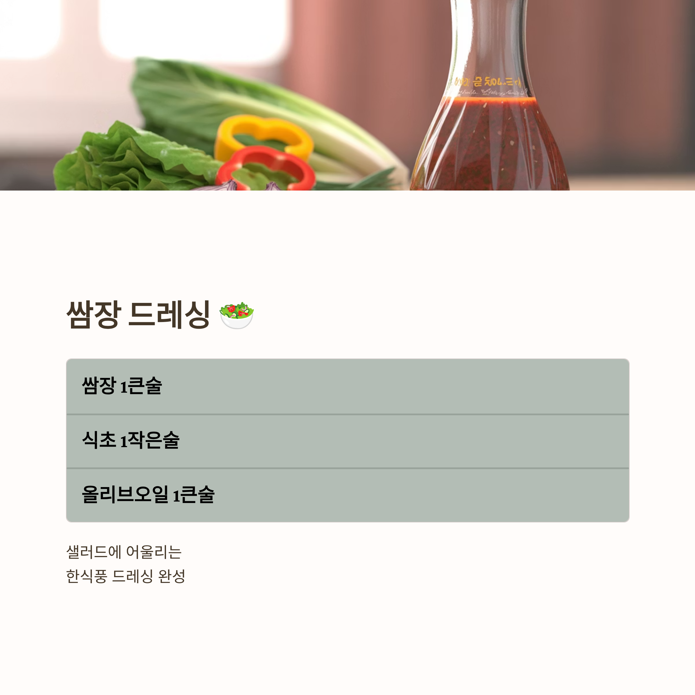 쌈장 드레싱: 쌈장 1큰술에 식초 1작은술, 올리브오일 1큰술을 섞으면
