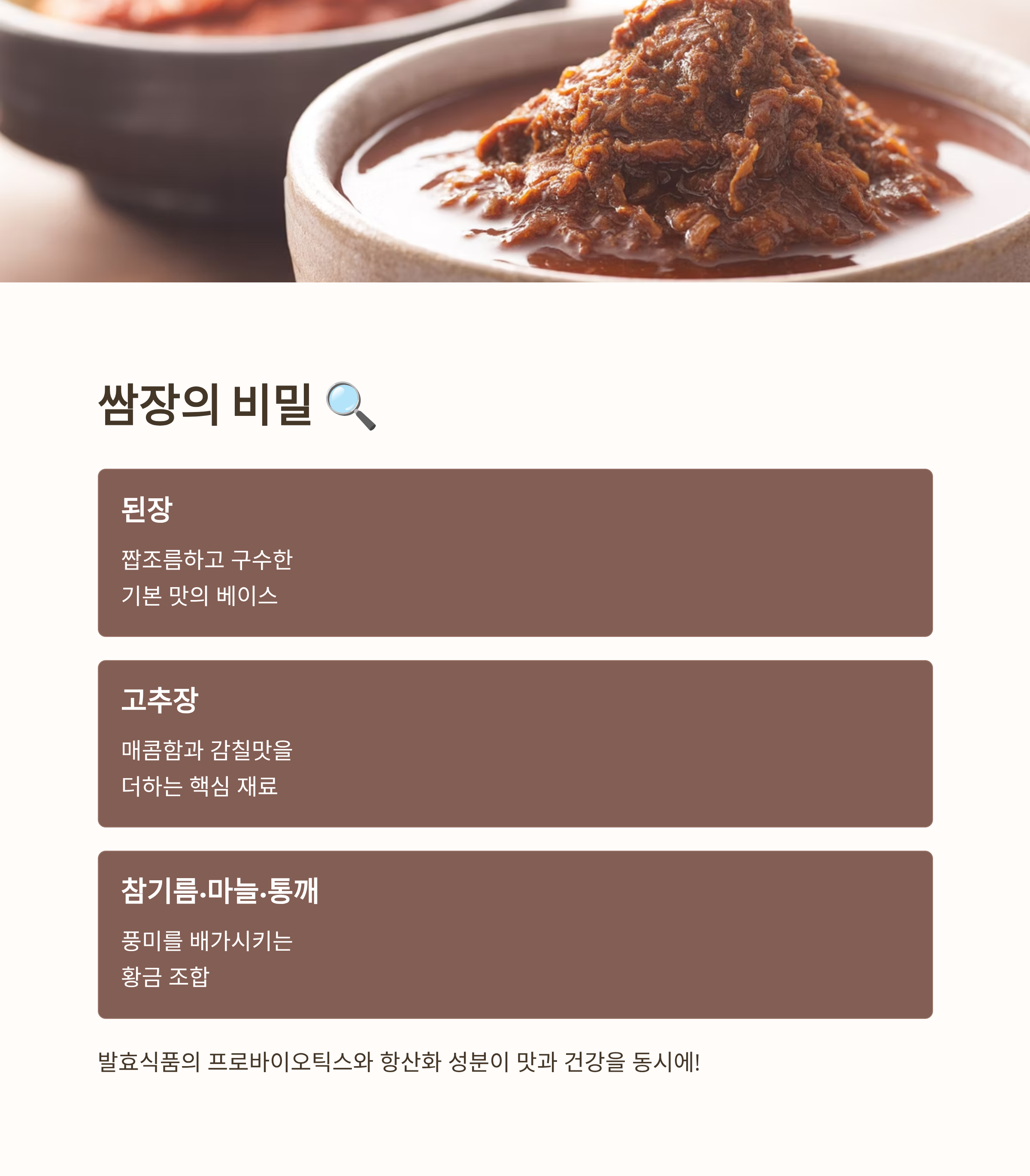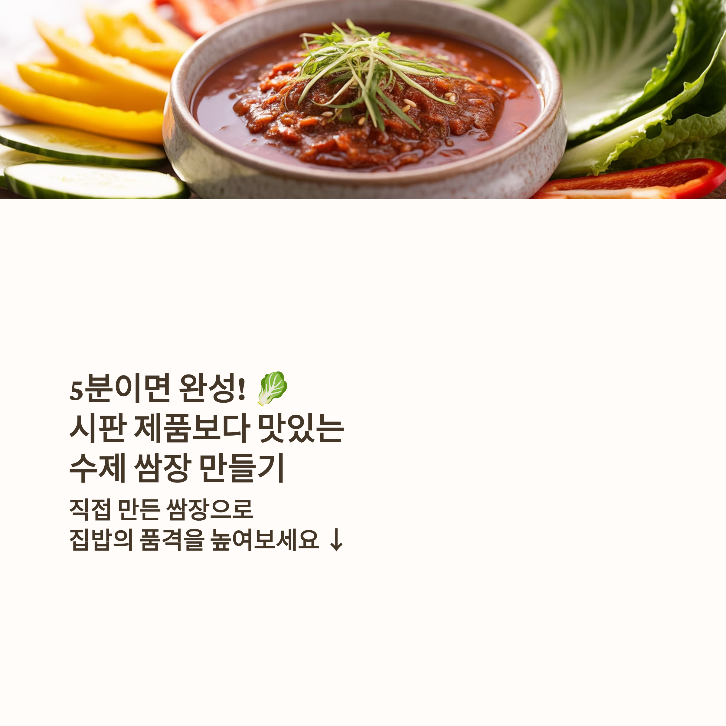 즉, 쌈장은 단순한 양념이 아니라 맛과 건강을 모두 챙길 수 있는 전통 발효 소스입니다.