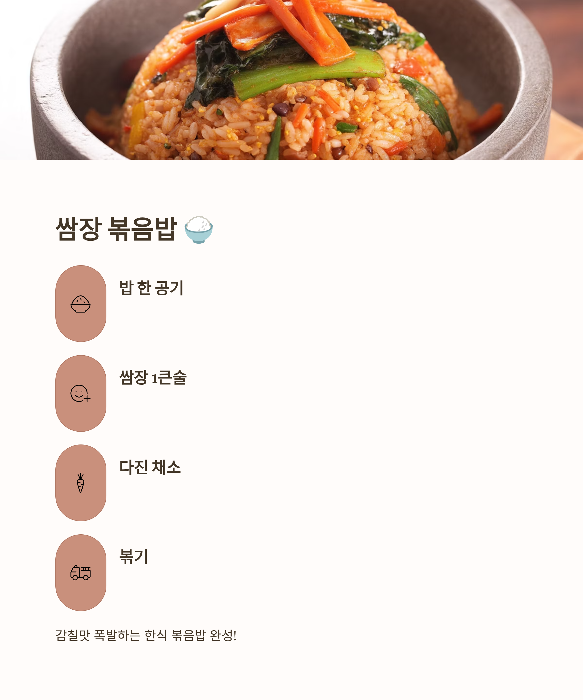 쌈장 볶음밥: 밥 한 공기에 쌈장 1큰술, 다진 채소와 함께 볶으면