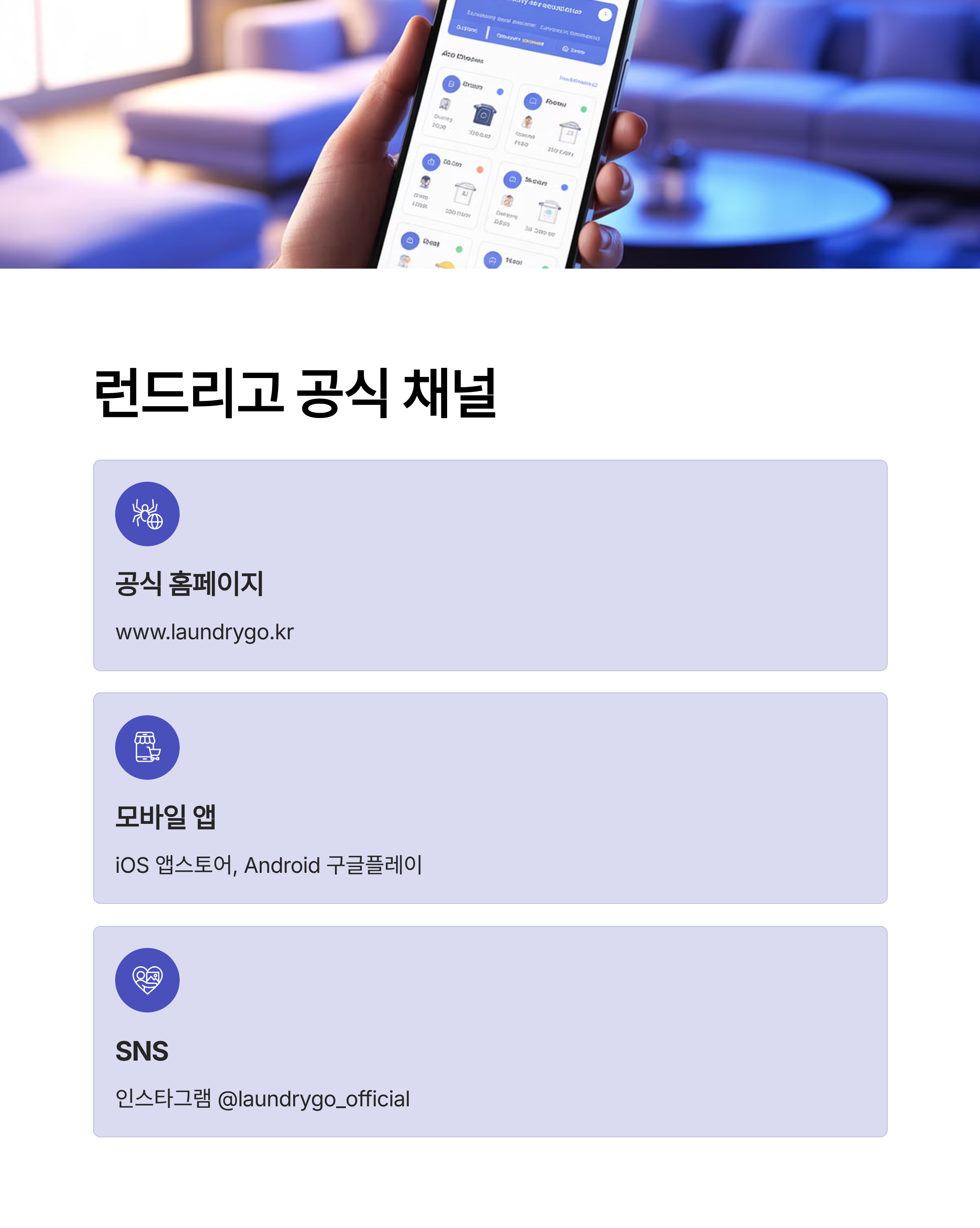 공식 SNS로는 인스타그램 계정 @laundrygo_official과 네이버 블로그 런드리고가 있습니다.