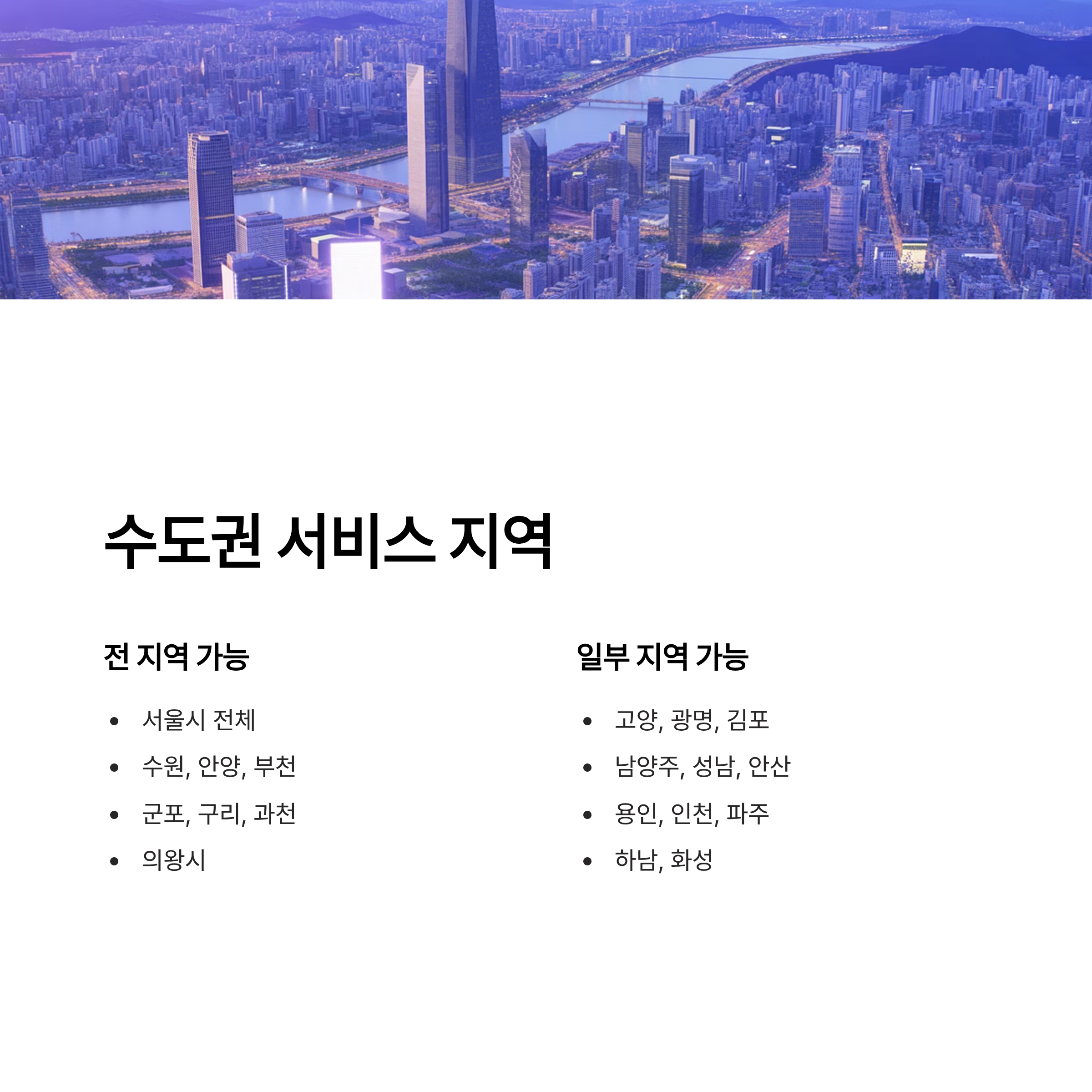 경기도에서는 수원시, 안양시, 부천시, 군포시, 구리시, 과천시, 의왕시가 전 지역 가능합니다.