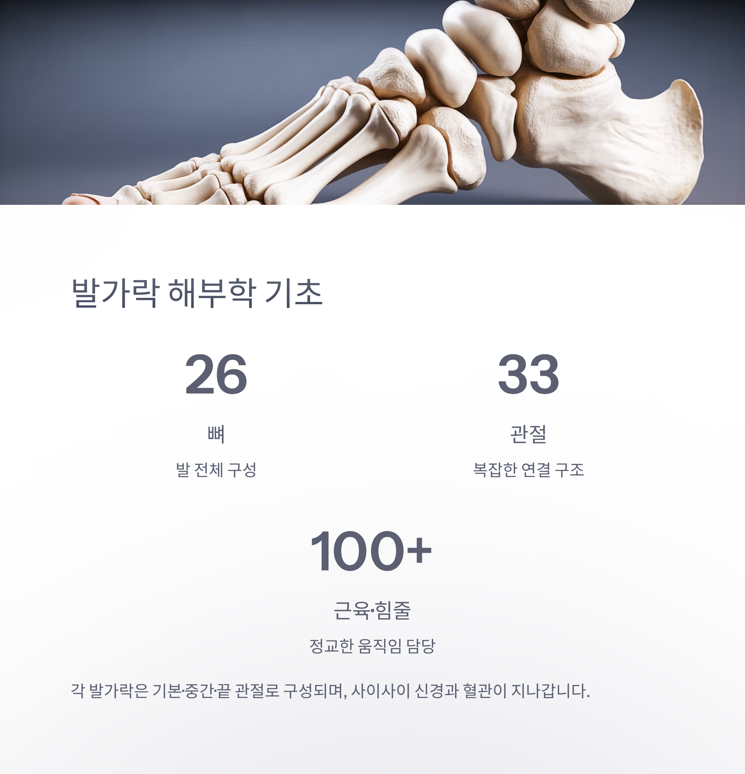 발은 총 26개 뼈, 33개 관절, 100개 이상의 근육과 힘줄, 복잡한 신경과 혈관으로 이루어진 정교한 구조입니다. 특히 발가락은 각각 기본 관절(중족지절 관절), 중간 관절(근위 지간 관절), 끝 관절(원위 지간 관절)로 구성되어 있으며, 각 관절 사이사이에 신경과 혈관이 지나갑니다.