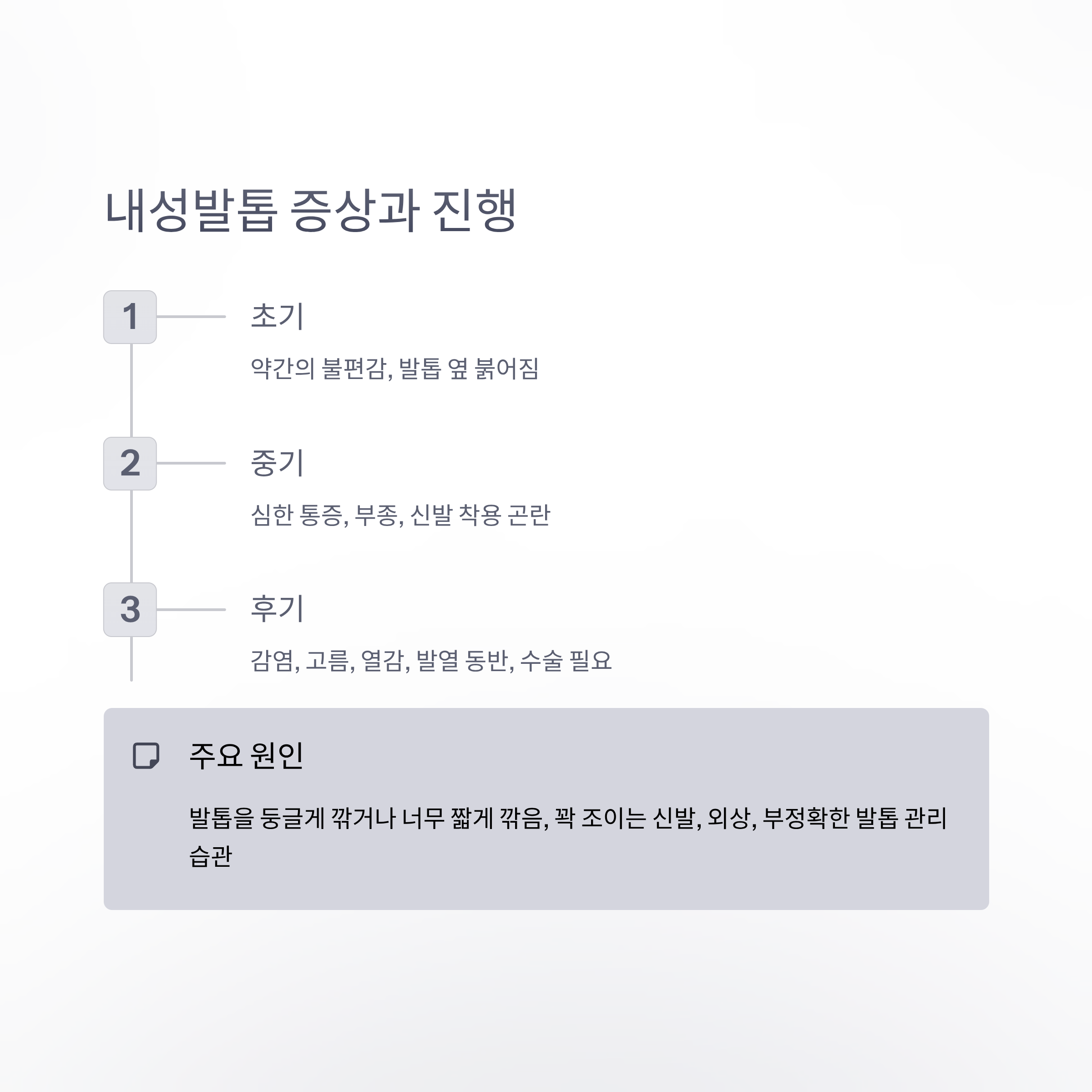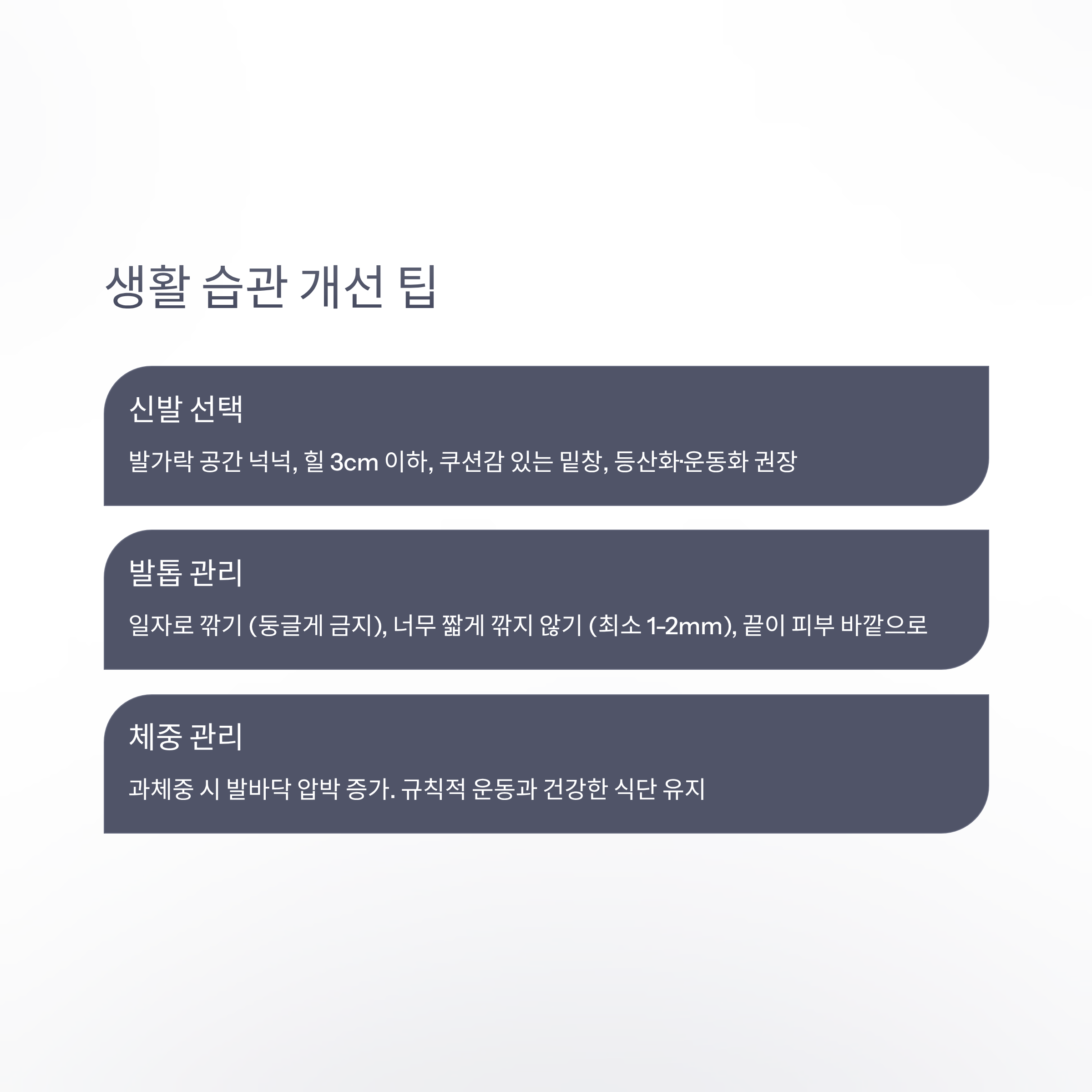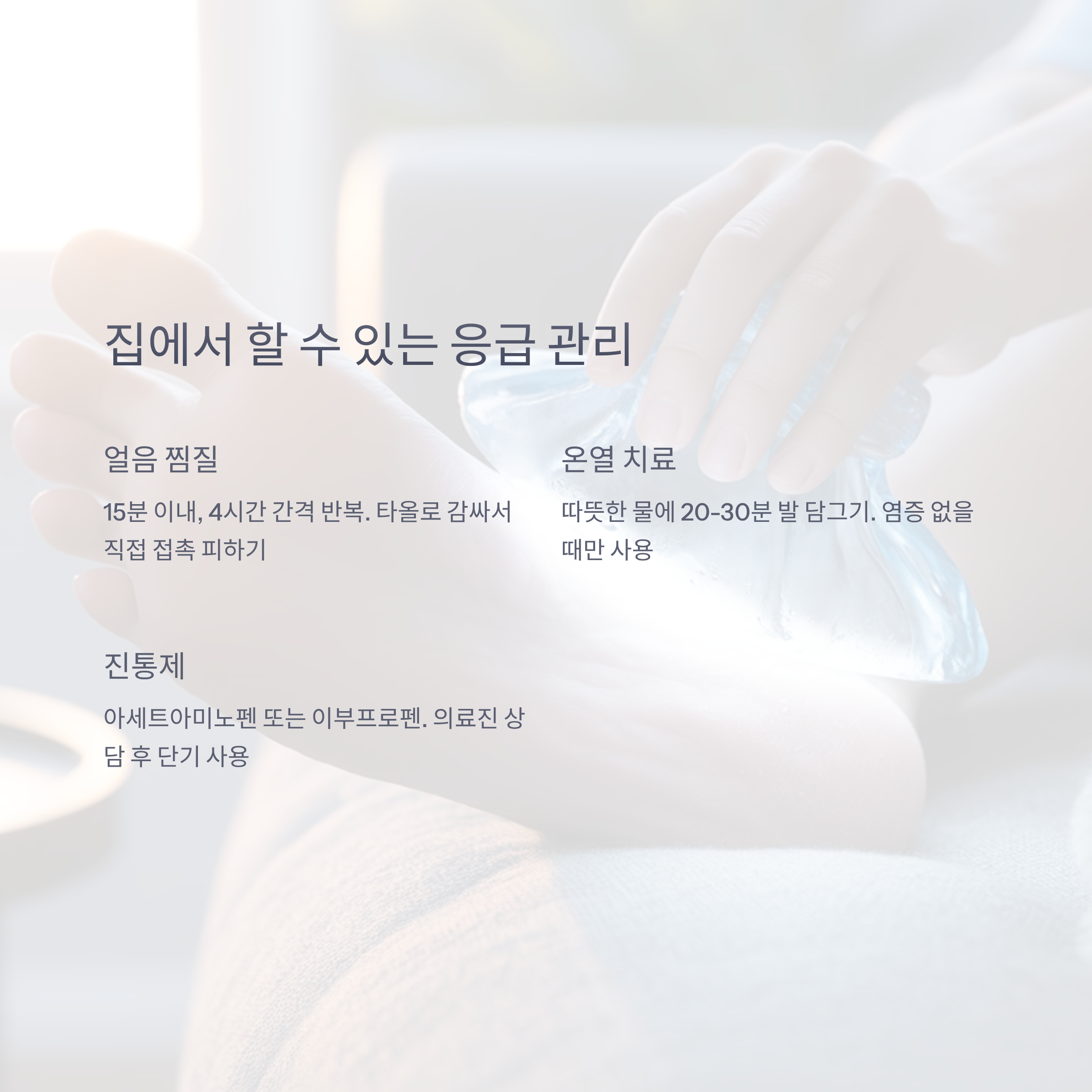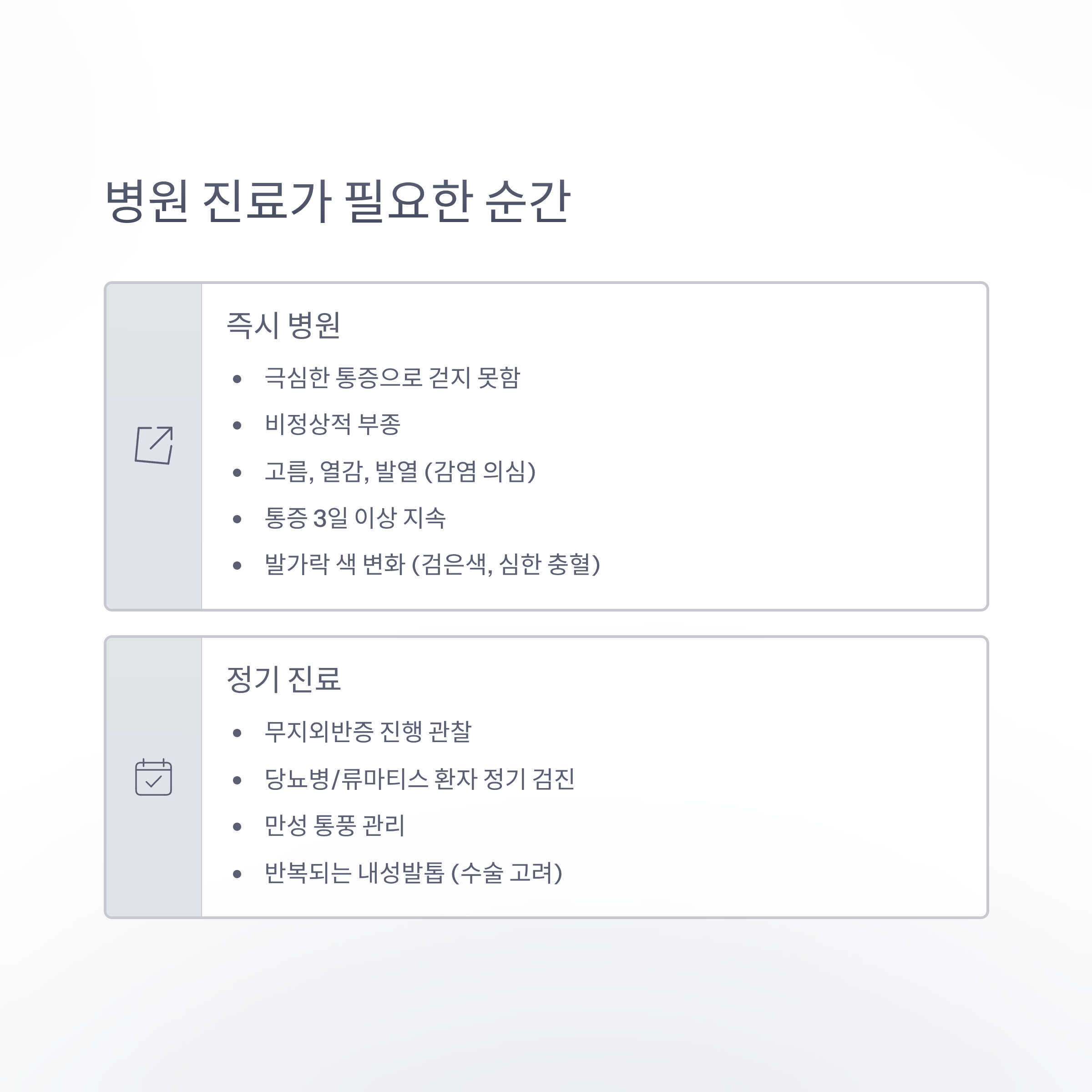 하지만 2주 이상 증상이 지속되거나 악화되면, 또는 감염 의심 증상이 있으면 반드시 정형외과나 족부 전문의를 방문하세요. 조기 진단과 적절한 치료가 발 건강을 지키고, 건강한 보행을 유지하는 최고의 방법입니다. 지금부터 당신의 발가락에 더 관심을 가져보세요!