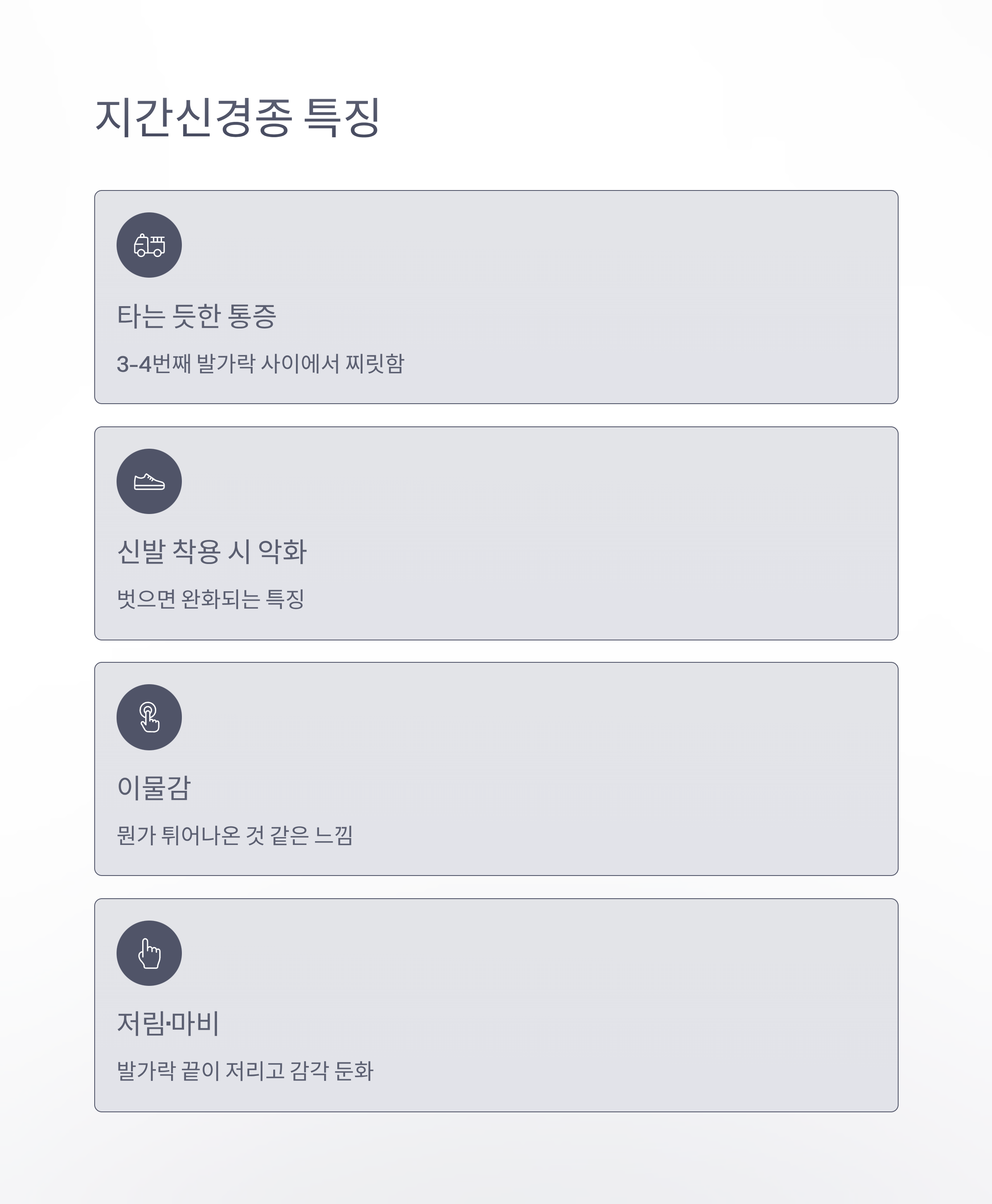 - 발가락 사이(주로 3-4번째)에서 타는 듯한, 찌릿한 통증