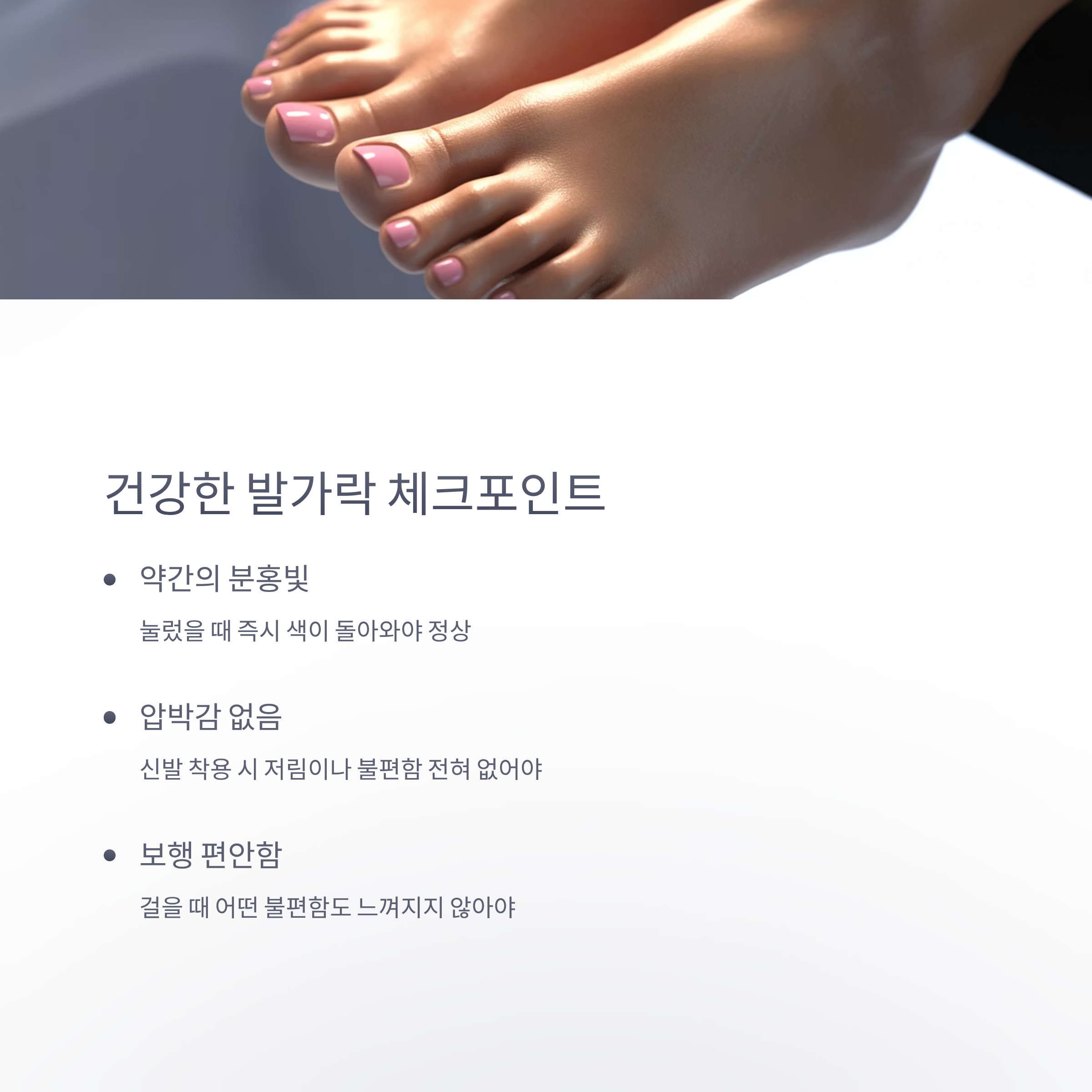 발가락이 건강하려면 약간의 분홍빛을 띠며, 눌렀을 때 즉시 색이 돌아와야 합니다. 신발을 신었을 때 압박감이나 저림 없이 편해야 하고, 걸을 때 불편함이 없어야 합니다.