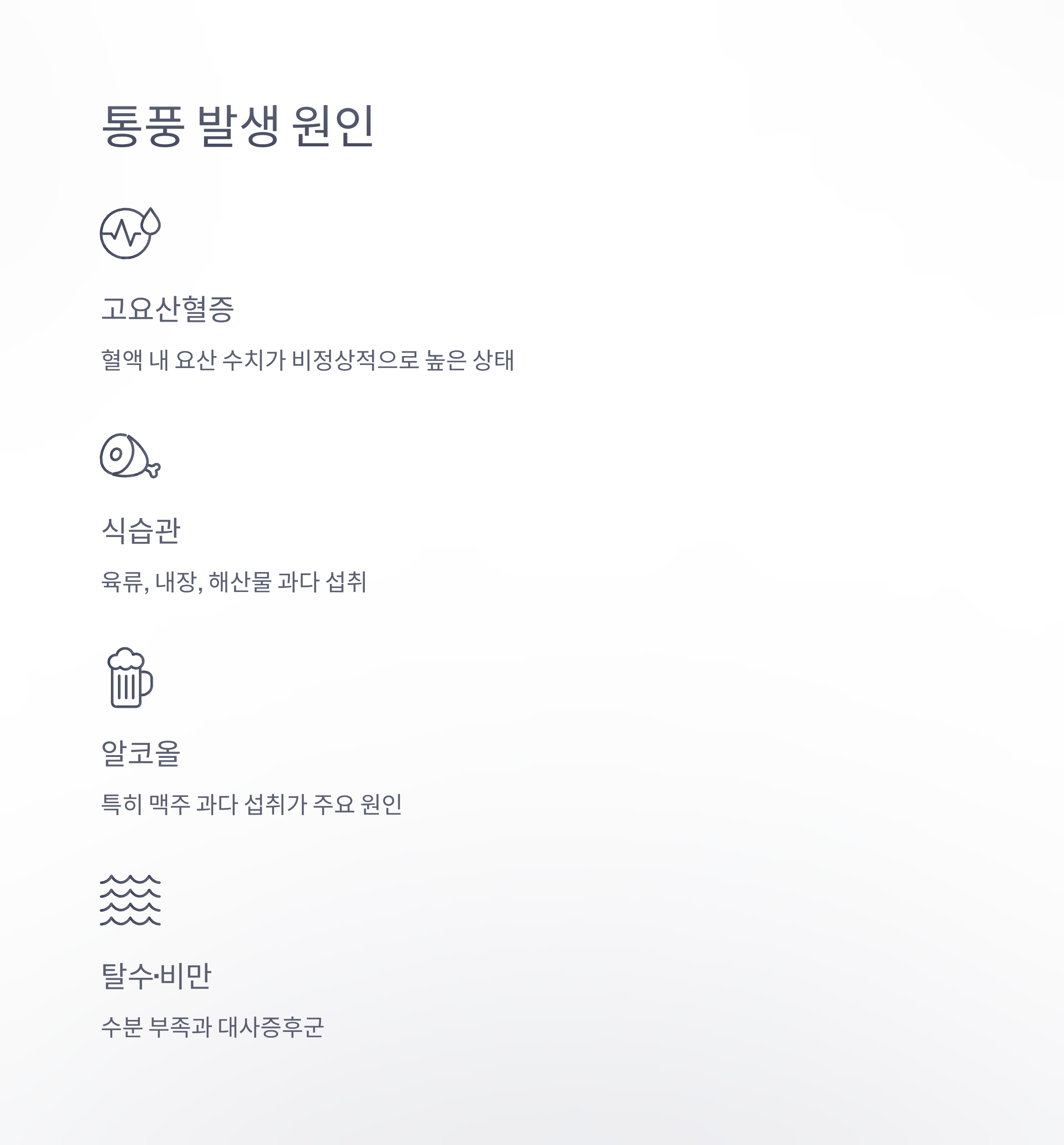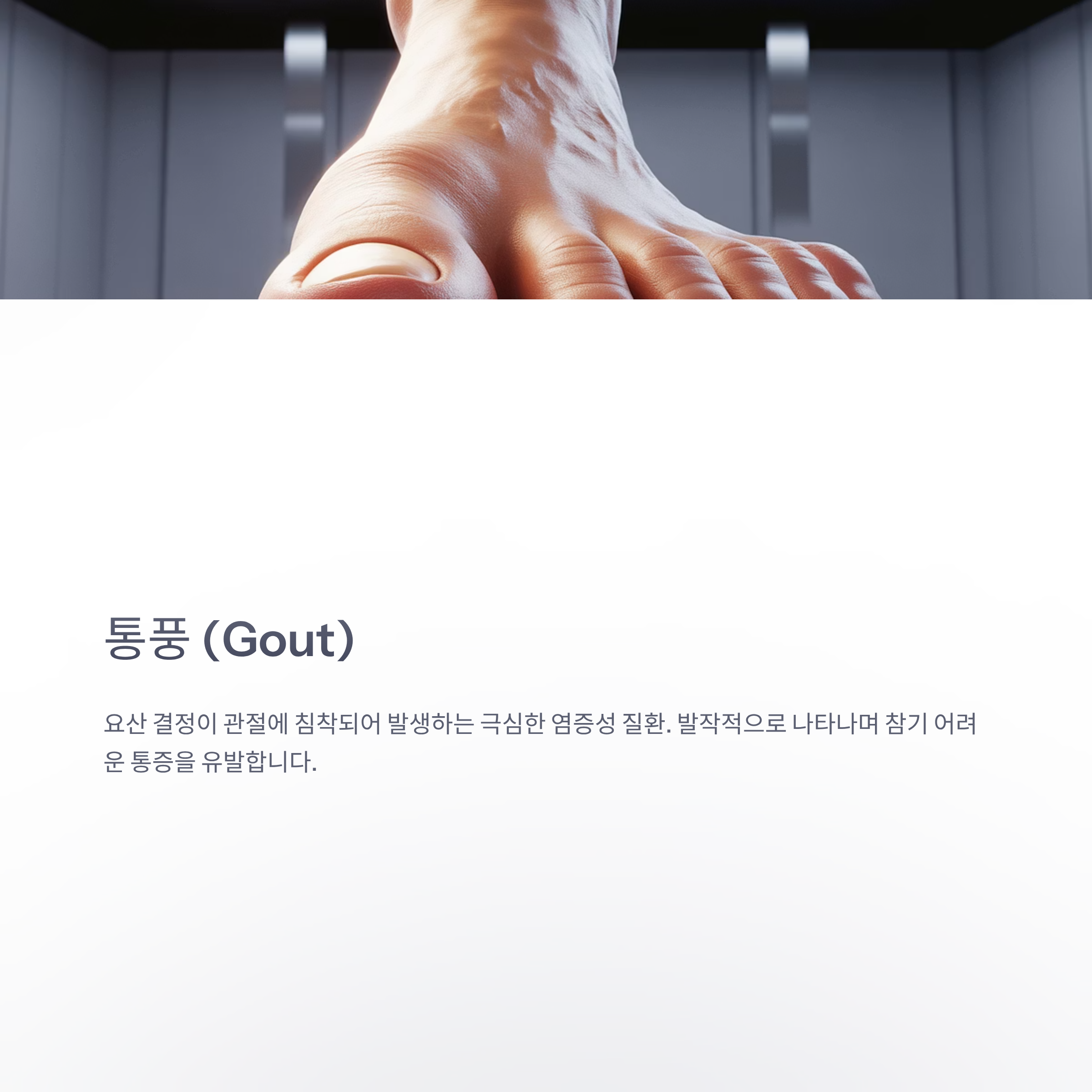 요산 결정이 관절에 침착되어 발생하는 극심한 염증성 질환입니다. 발작적으로 나타나며 참기 어려운 통증을 유발합니다.