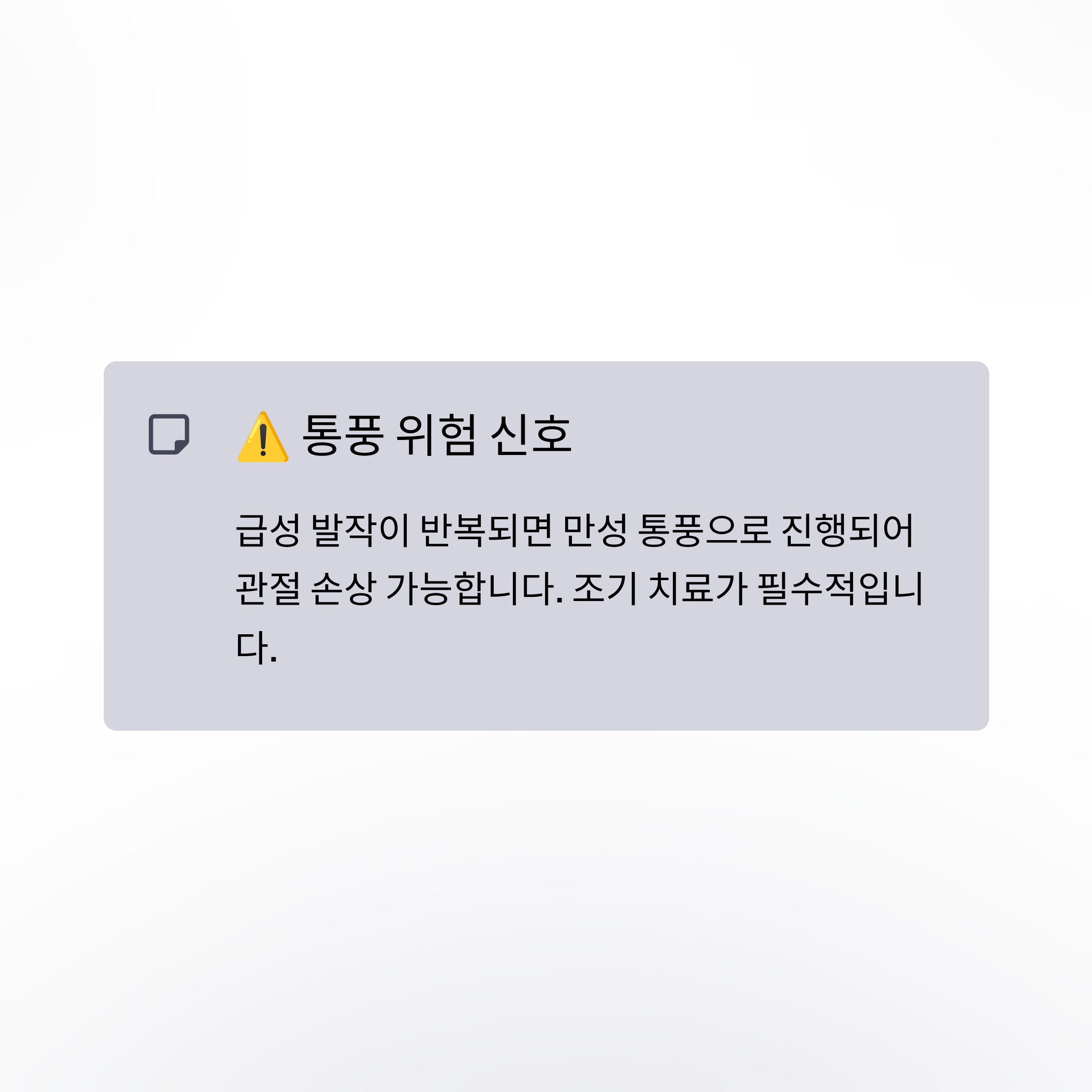 급성 발작이 반복되면 만성 통풍으로 진행되어 관절 손상 가능