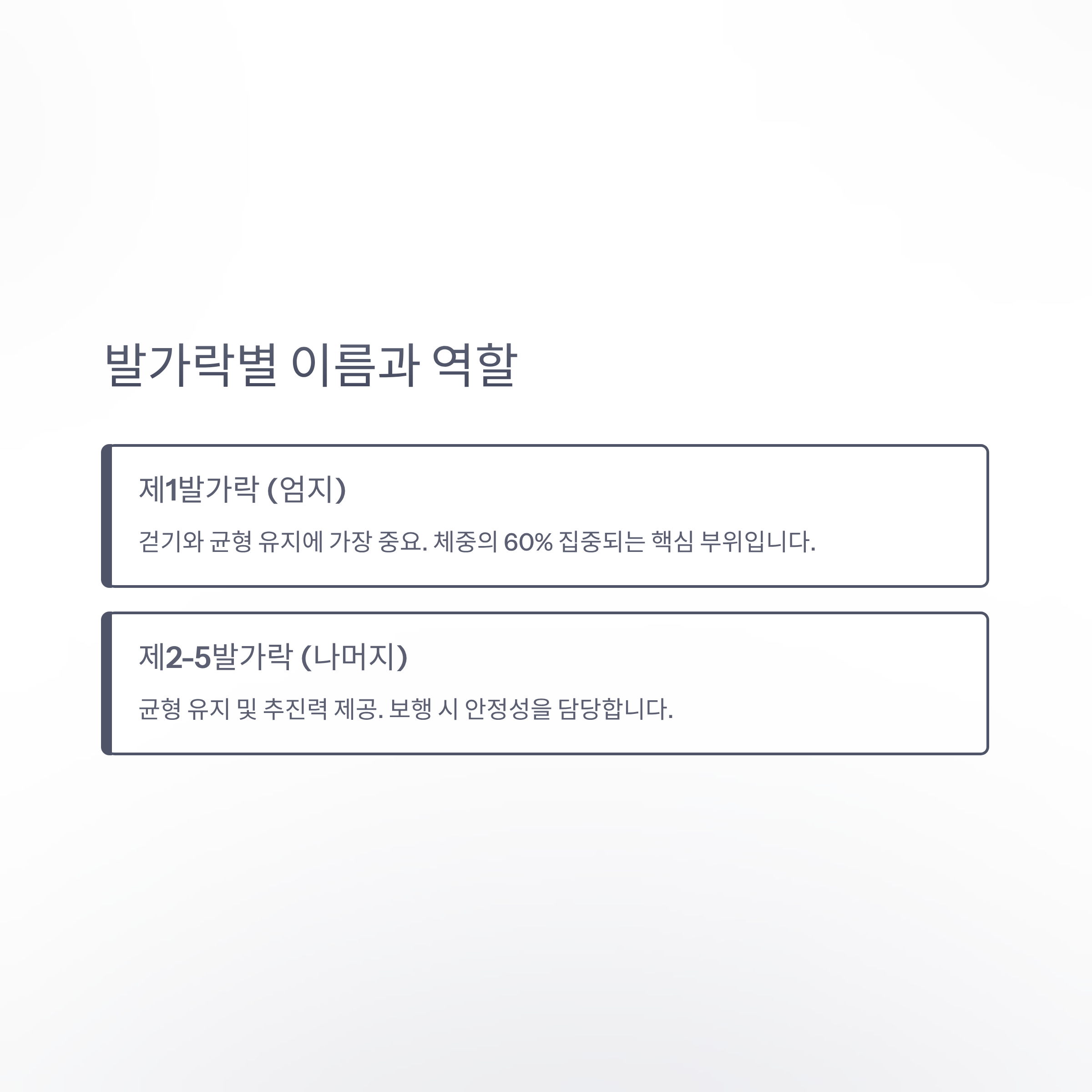 - 제1발가락(엄지발가락): 걷기와 균형 유지에 가장 중요, 체중의 60% 집중