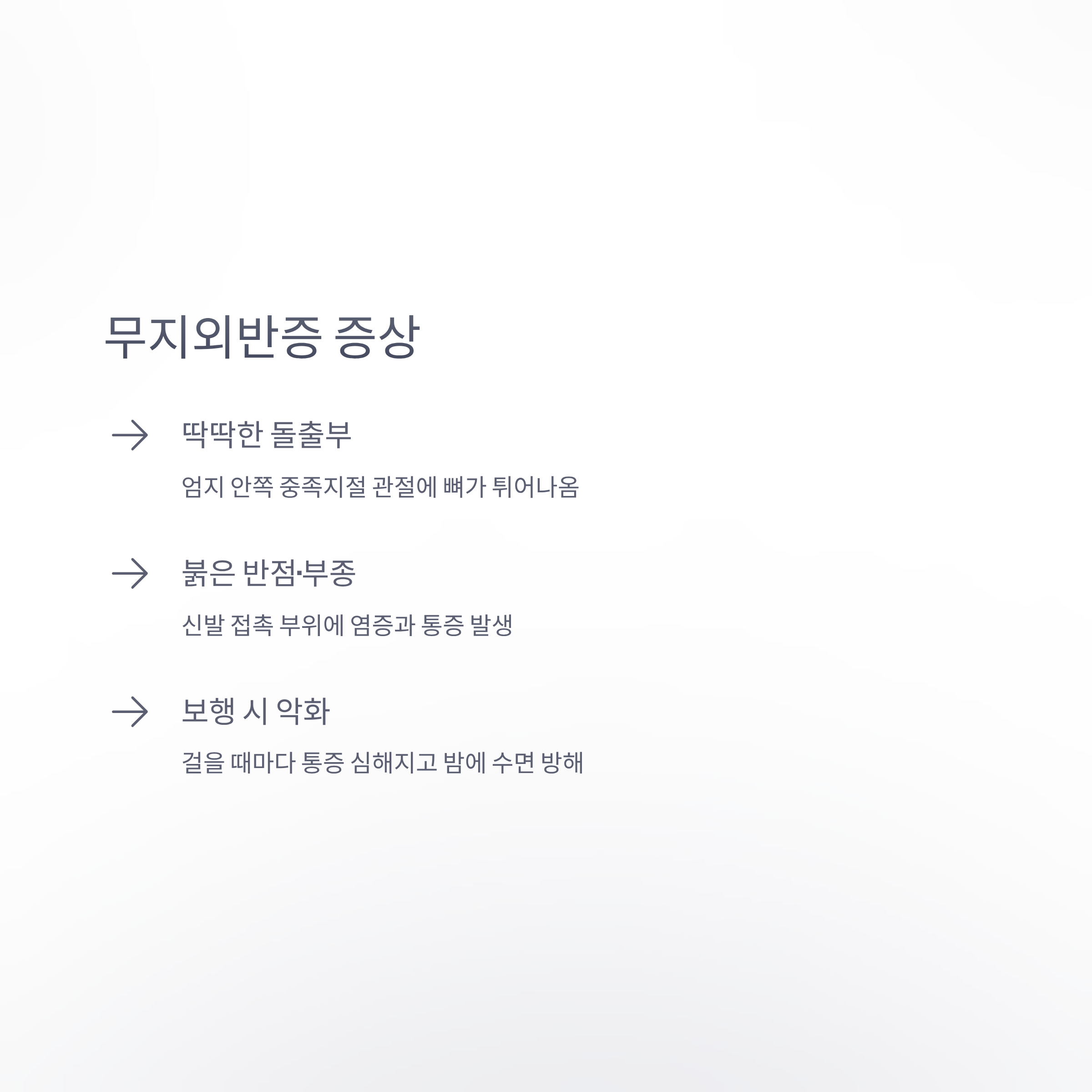 엄지발가락이 바깥쪽으로 점점 휘면서 안쪽에 뼈가 튀어나오는 질환입니다. 초기에는 미관상 문제만 있지만, 진행되면 심한 통증을 유발합니다.