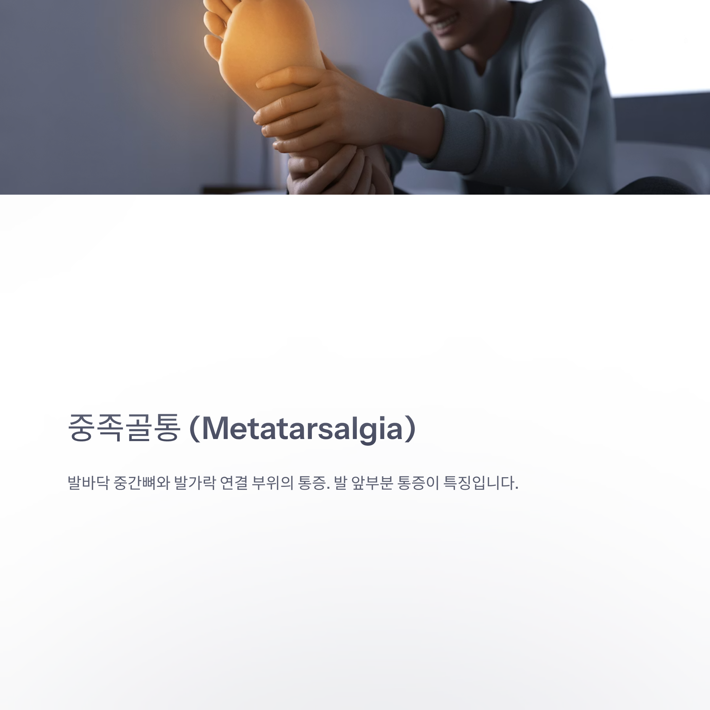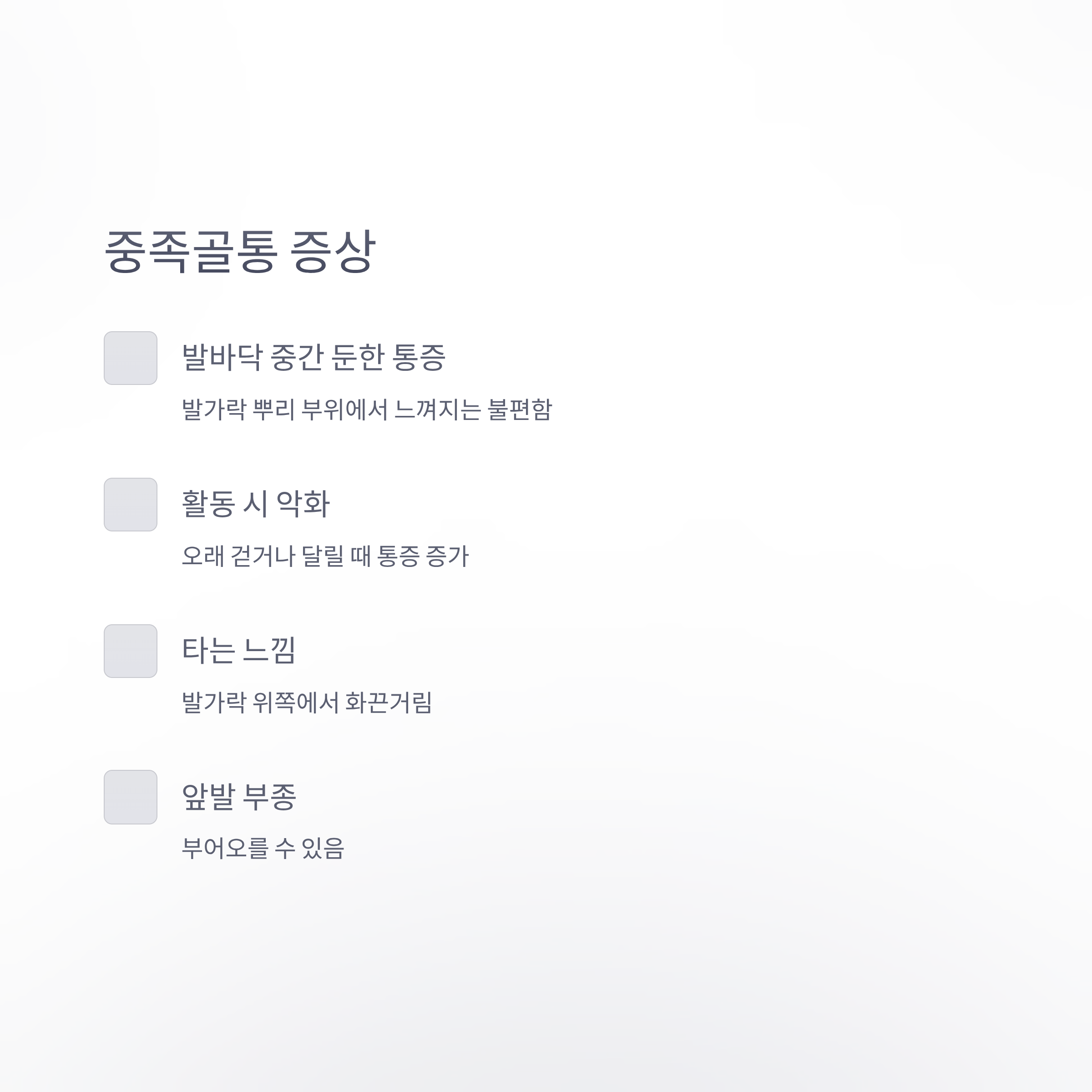 - 발바닥 중간(발가락 뿌리 부위)의 둔한 통증