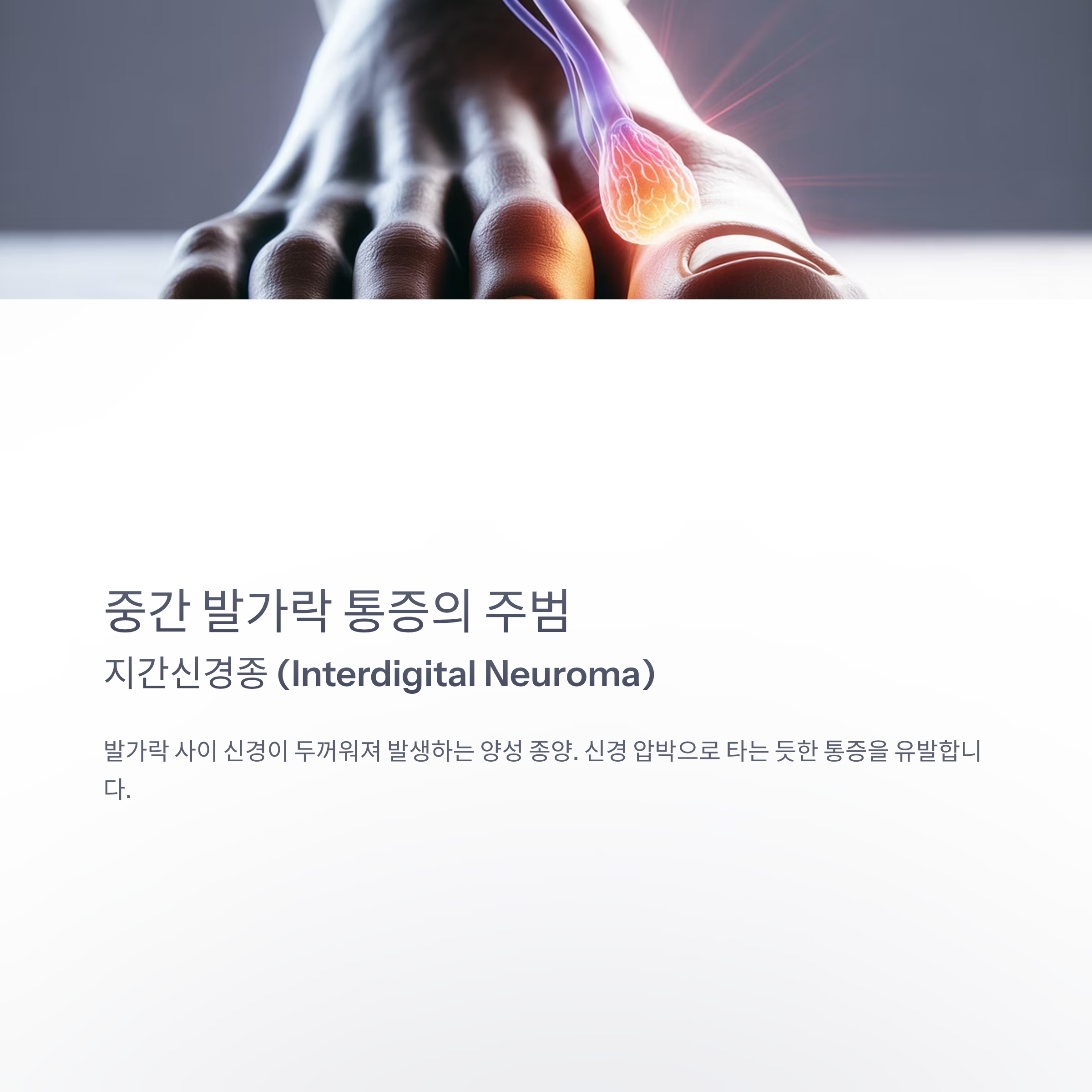 발가락 사이의 신경이 두꺼워져서 발생하는 양성 종양입니다. 신경 압박으로 타는 듯한 통증을 유발합니다.