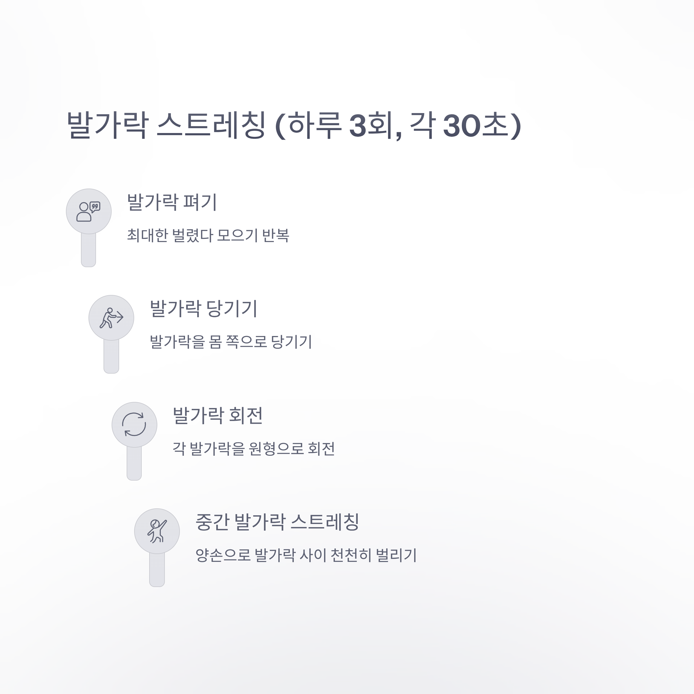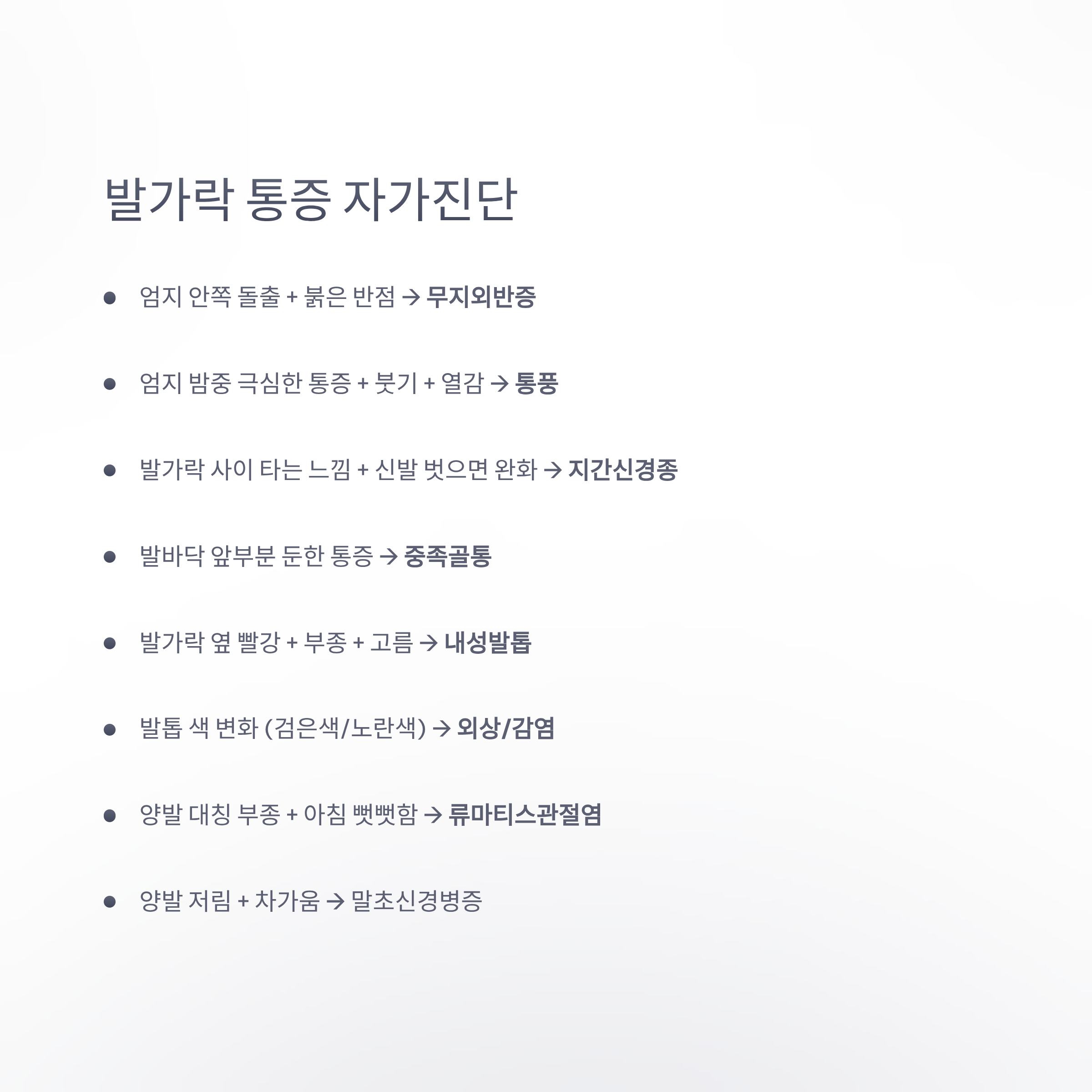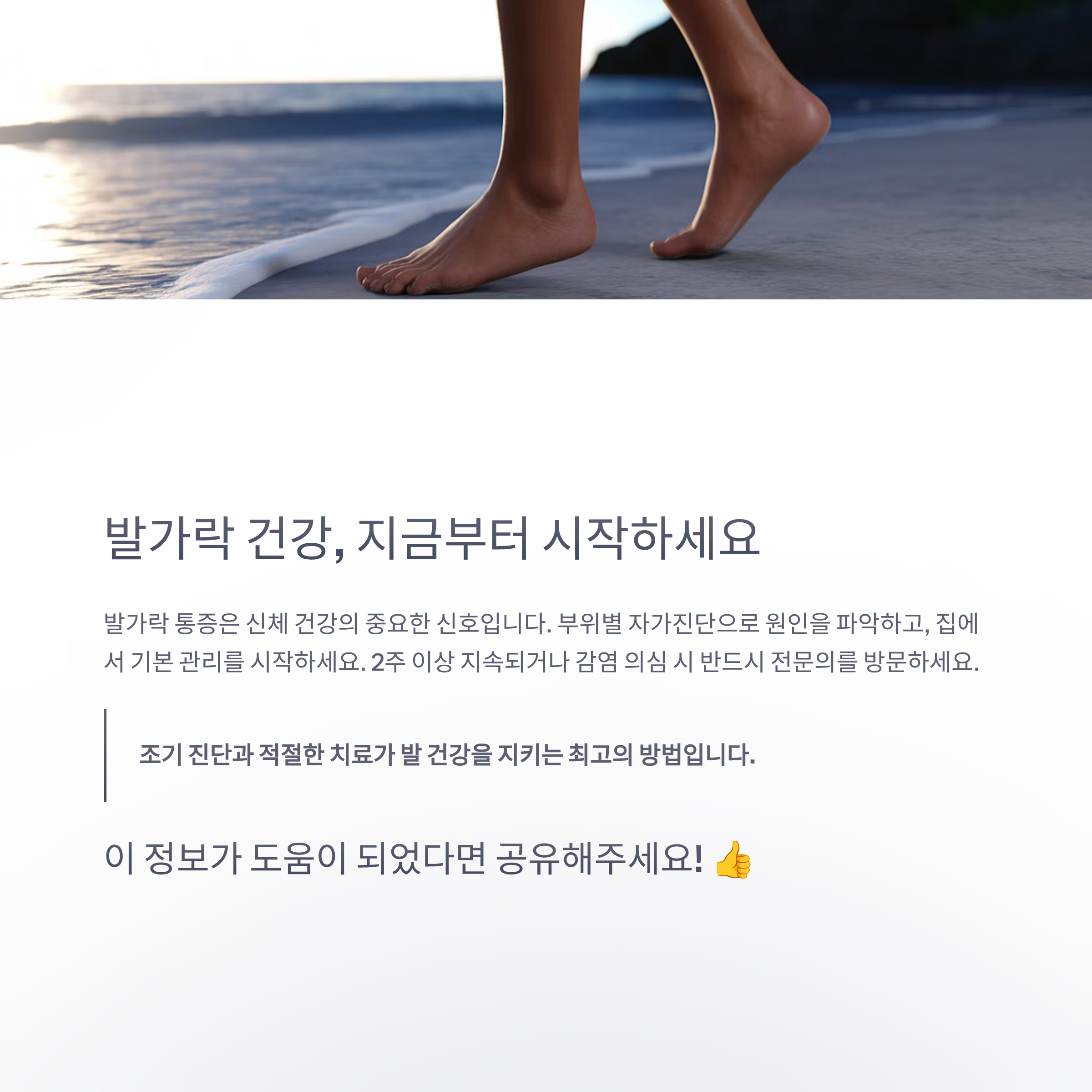 발가락 통증은 비단순한 불편함이 아니라 신체 건강의 중요한 신호입니다. 오늘부터 내가 느끼는 통증이 어느 부위인지, 어떤 상황에 심해지는지 꼼꼼하게 체크하고, 자가진단을 통해 대략의 원인을 파악하세요. 집에서의 기본 관리(스트레칭, 신발 개선, 얼음찜질)로 많은 경우 증상이 개선됩니다.