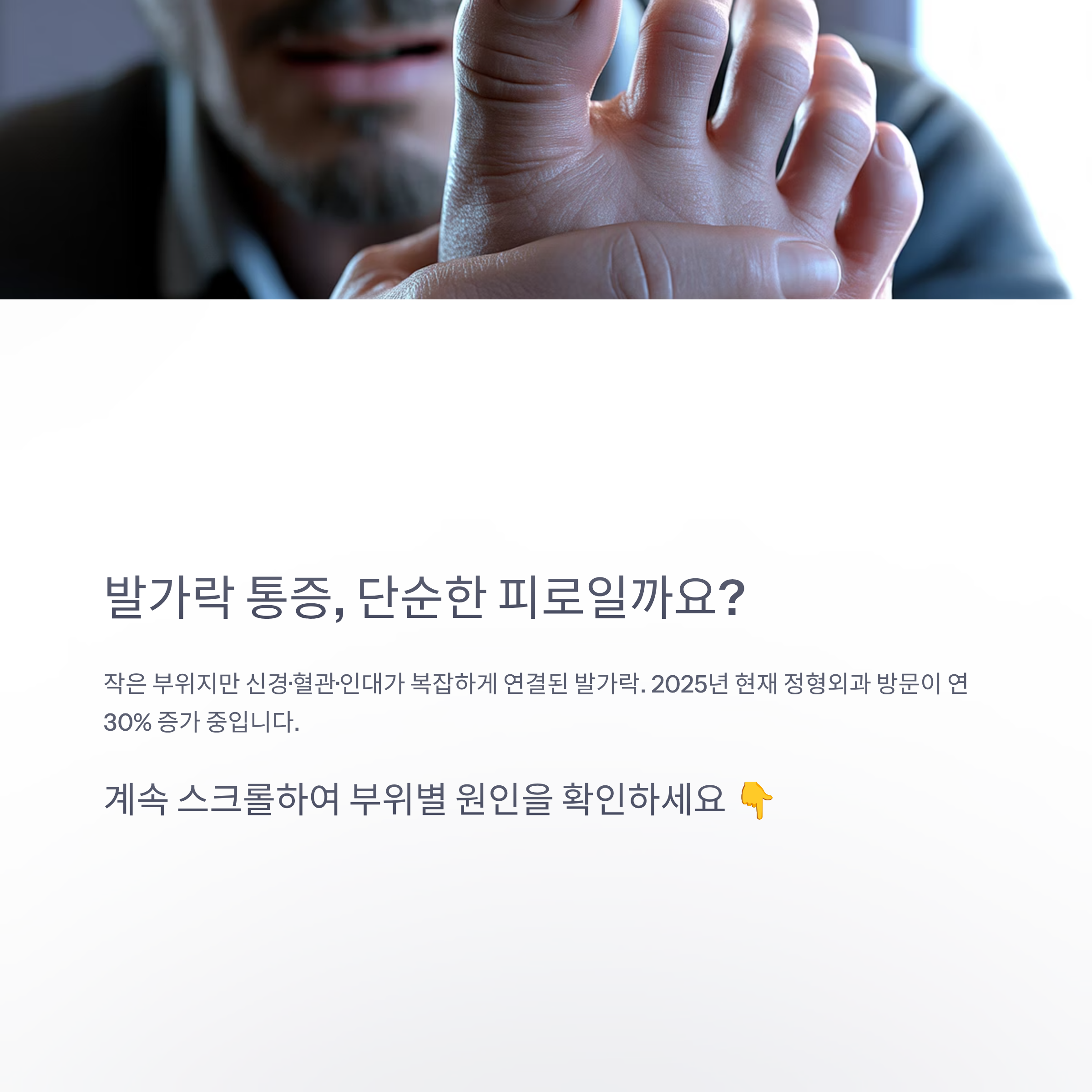발가락에 갑자기 통증이 느껴질 때, 단순히 오래 걸어서 그런 것일까 아니면 심각한 질환의 신호일까 고민해보신 적 있으신가요? 실제로 발가락은 작은 부위이지만 신경과 혈관, 인대, 관절이 복잡하게 연결되어 있어 통증의 부위에 따라 원인과 대응법이 크게 달라집니다. 2025년 현재, 발가락 통증으로 인한 정형외과 방문이 연 30% 이상 증가하고 있으며, 특히 20대 직장인부터 60대 노년층까지 전 연령에서 발생하고 있습니다.