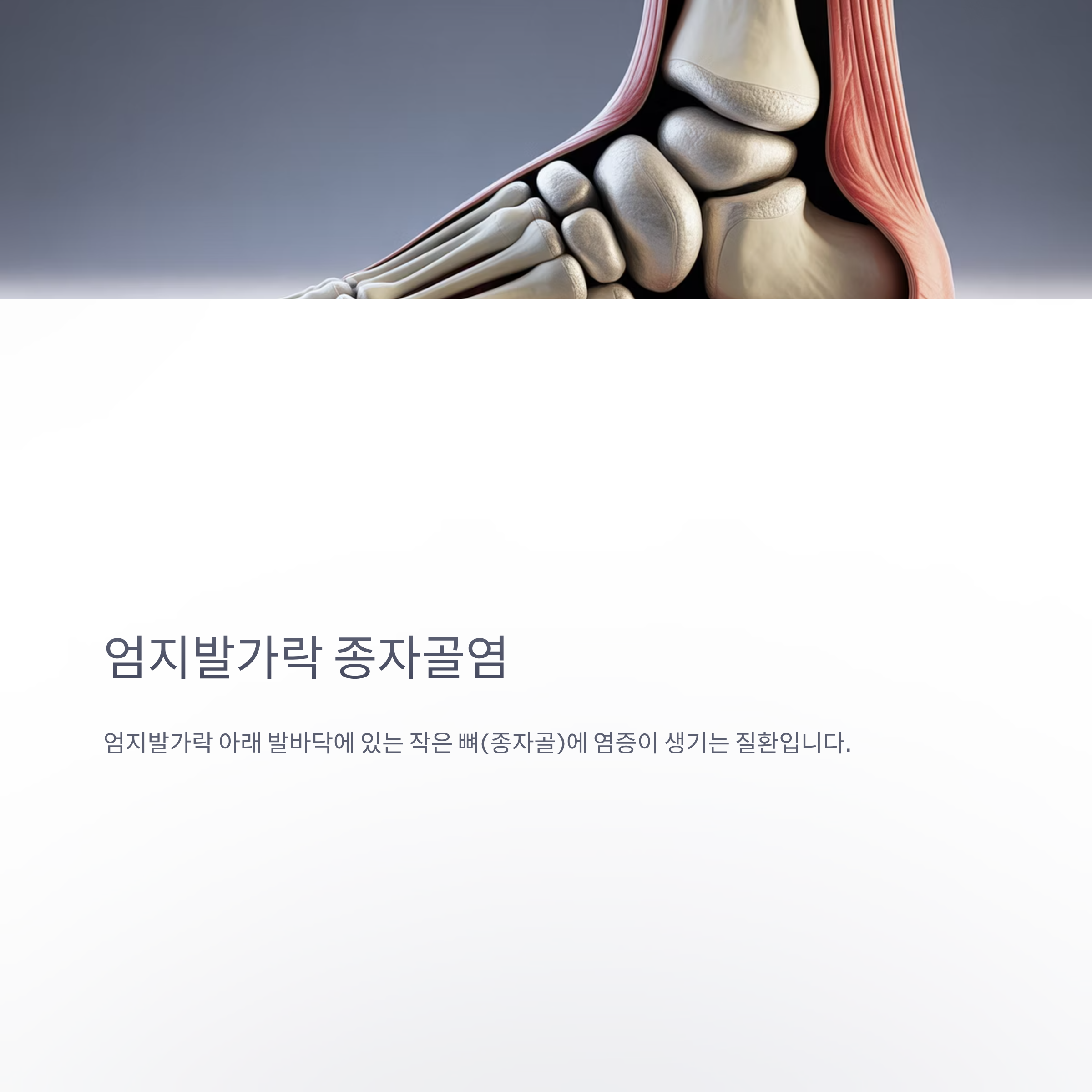 엄지발가락 아래 발바닥에 있는 작은 뼈(종자골) 염증으로 발생합니다.