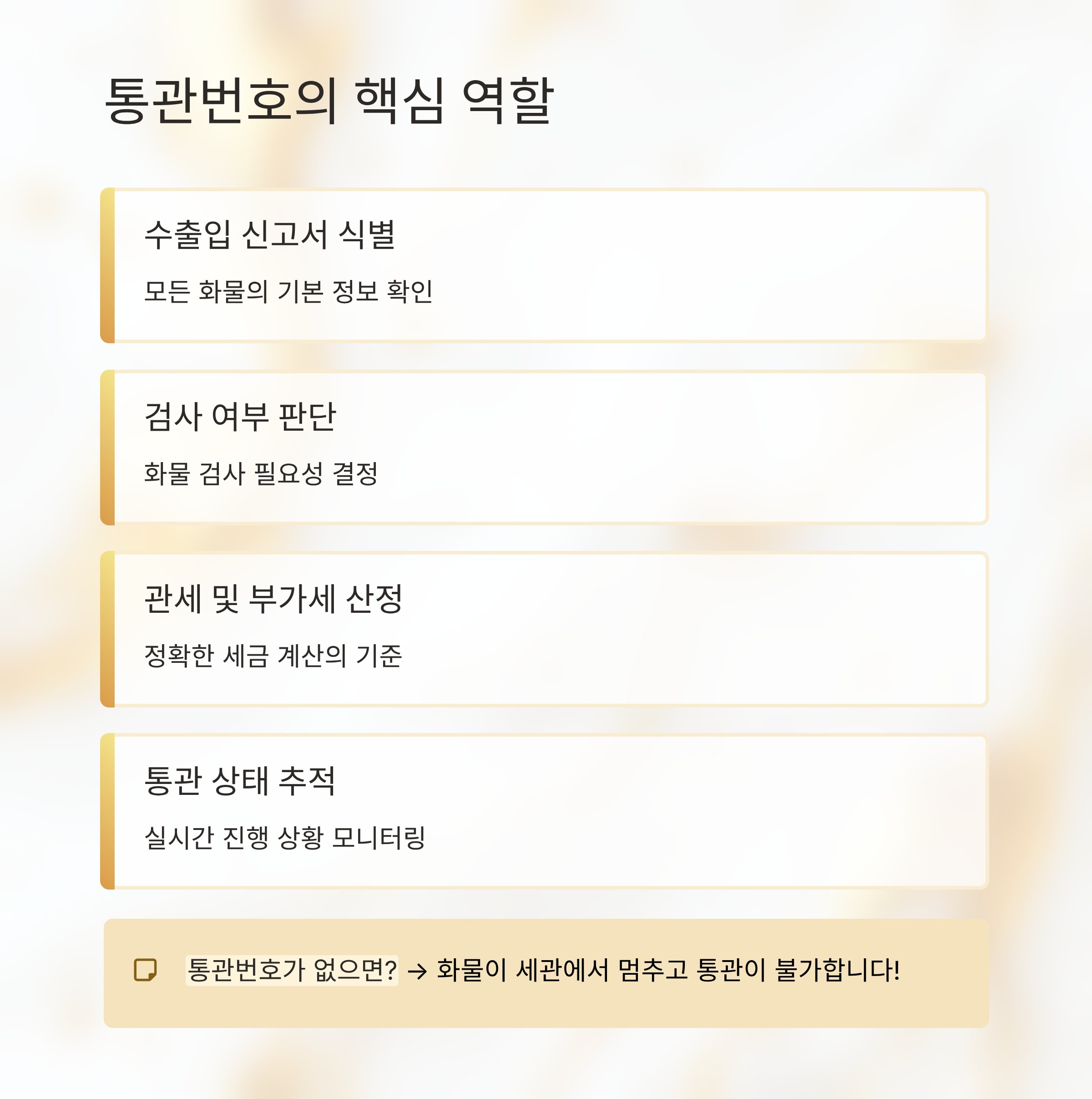 세관에서는 이 번호를 기준으로 수출입 신호, 검역 여부, 신고 내역, 관세 납부 현황 등 모든 통관 기록을 조회합니다.