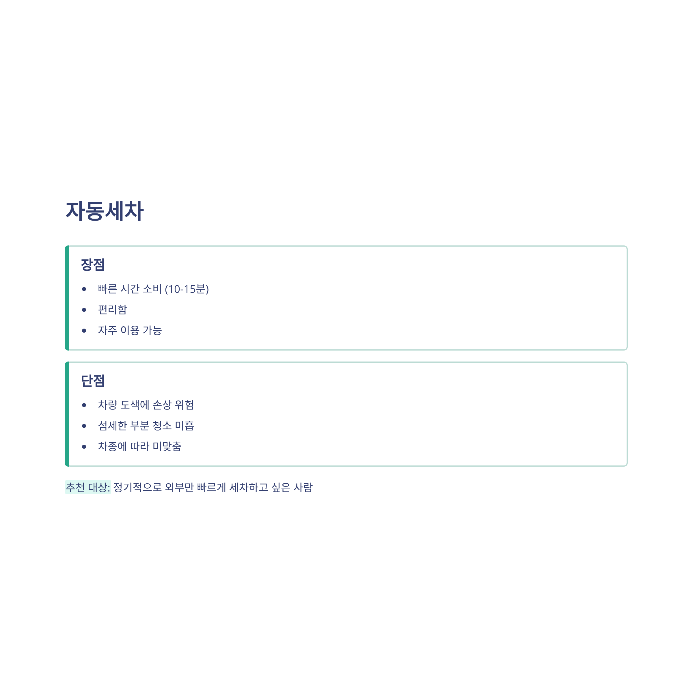 각 세차 방식의 장단점을 명확히 이해하면 자신에게 맞는 선택을 할 수 있습니다.