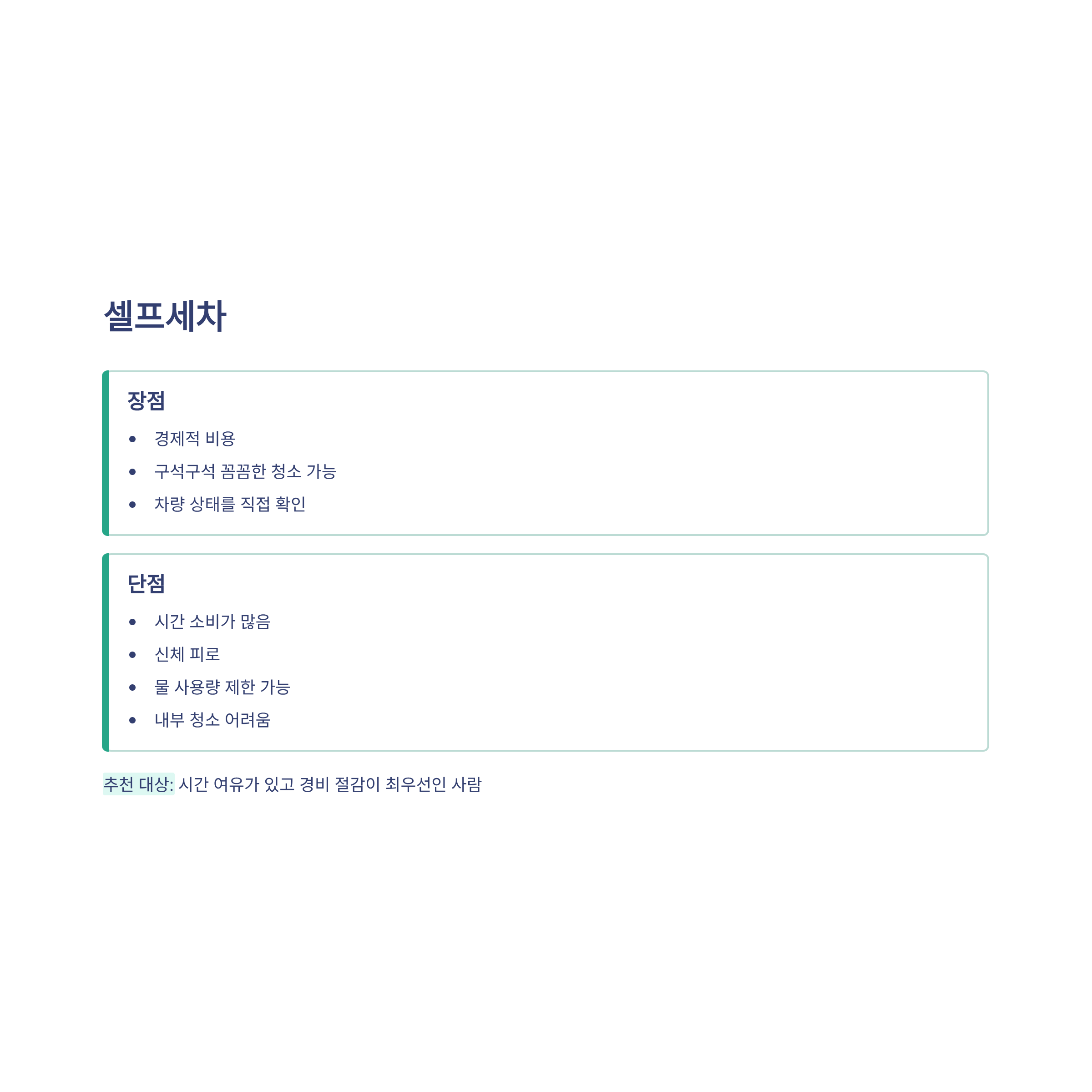 장점: 경제적 비용, 구석구석 꼼꼼한 청소 가능, 차량 상태를 직접 확인 가능