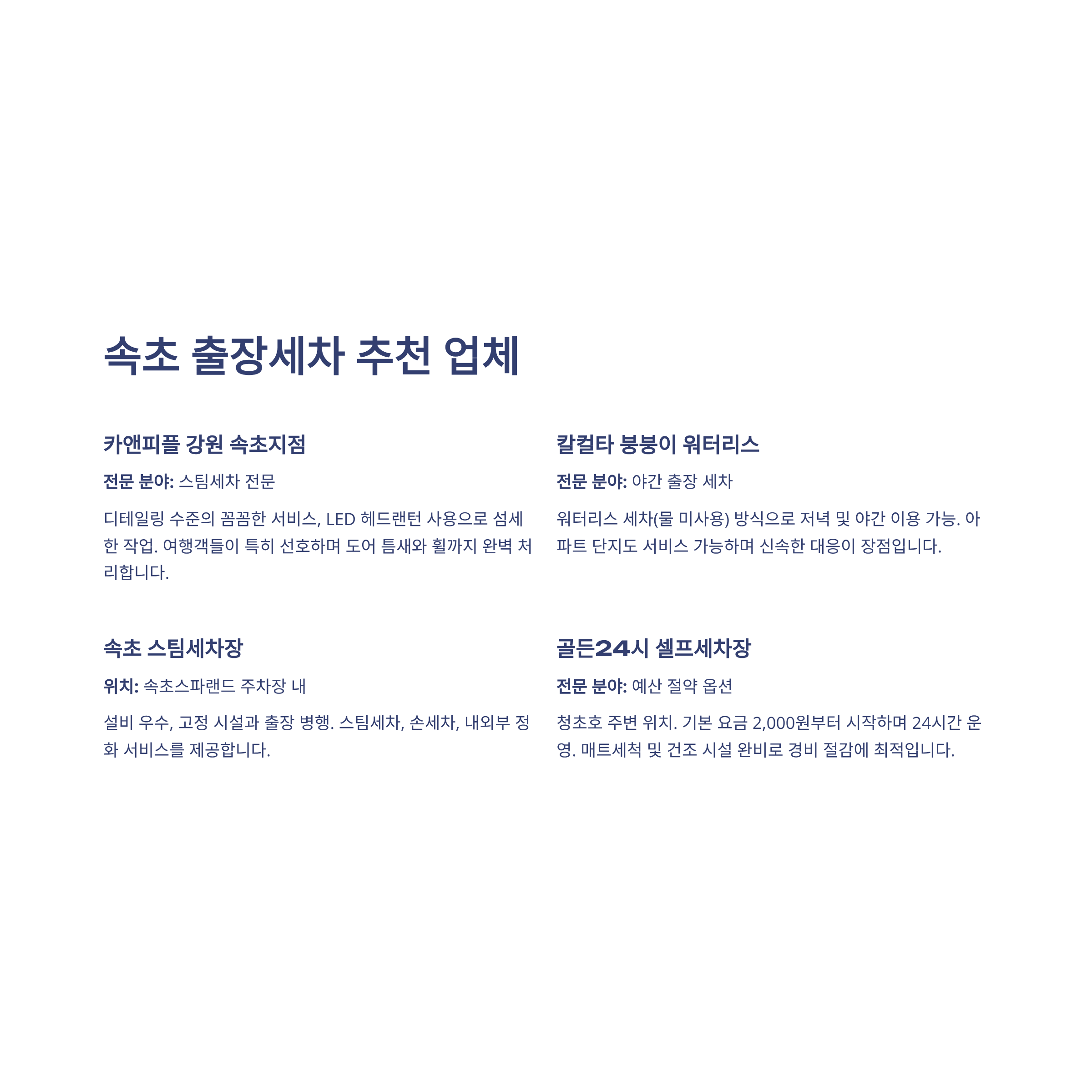 특히 강원도 속초의 해변, 산악 지역 여행 후에는 일반 세차장에서 감당 못 할 정도의 모래와 오염물이 차량에 부착됩니다. 이때 스팀세차와 디테일링까지 제공하는 출장세차 서비스는 여행의 퀄리티를 한 단계 높여줍니다.